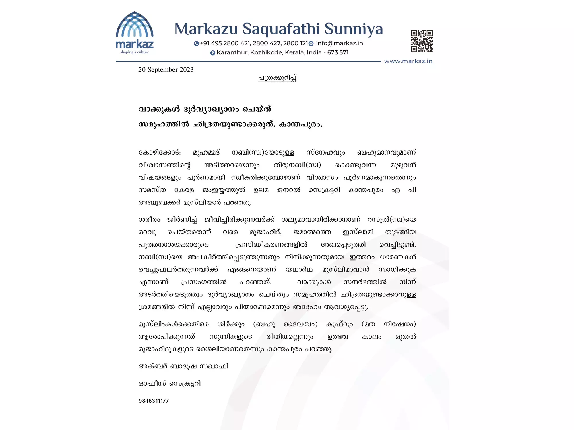 വാക്കുകള് സന്ദര്ഭത്തില് നിന്ന് അടര്ത്തിയെടുത്തും ദുര്വ്യാഖ്യാനം ചെയ്തും സമൂഹത്തില് ഛിദ്രതയുണ്ടാക്കാനുള്ള ശ്രമങ്ങളില് നിന്ന് എല്ലാവരും പിന്മാറണം. മുസ്ലിംകള്ക്കെതിരെ ബഹു ദൈവത്വവും മത നിഷേധവും ആരോപിക്കുന്നത് സുന്നികളുടെ രീതിയല്ലെന്നും ഉത്ഭവ കാലം മുതല് മുജാഹിദുകളുടെ ശൈലിയാണതെന്നും കാന്തപുരം ആരോപിച്ചു.