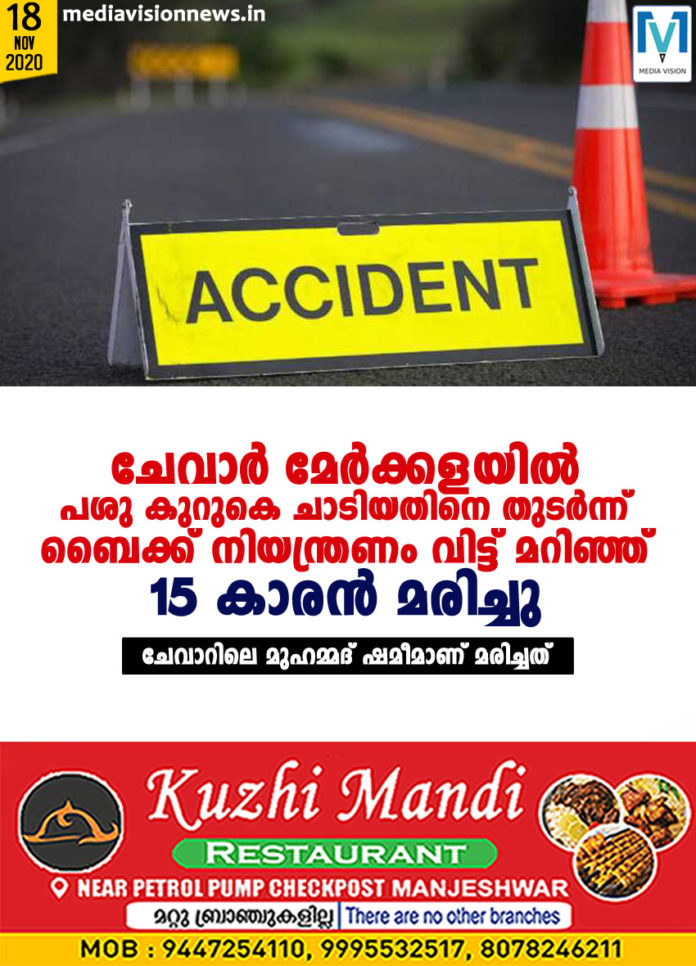 Home Latest news ചേവാർ മേർക്കളയിൽ പശു കുറുകെ ചാടിയതിനെ തുടര്ന്ന് ബൈക്ക് നിയന്ത്രണം വിട്ട് മറിഞ്ഞ് 15 കാരന്...