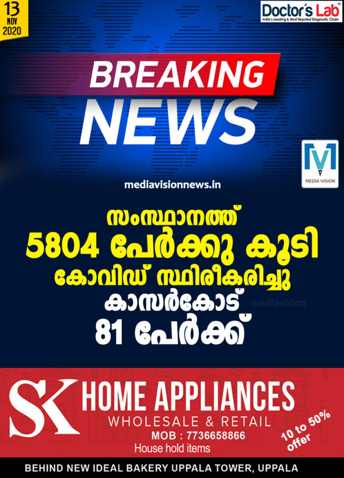 സംസ്ഥാനത്ത് 5804 പേര്‍ക്കു കൂടി കോവിഡ് സ്ഥിരീകരിച്ചു; കാസര്‍കോട് 81 പേര്‍ക്ക്‌