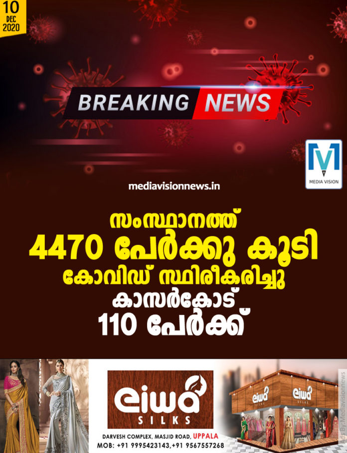 തിരുവനന്തപുരം :(www.mediavisionnews.in)സംസ്ഥാനത്ത് ഇന്ന് 4470 പേര്ക്ക് കോവിഡ്-19 സ്ഥിരീകരിച്ചു. മലപ്പുറം 700, കോഴിക്കോട് 578, എറണാകുളം 555, തൃശൂര് 393, കോട്ടയം 346, കൊല്ലം 305, ആലപ്പുഴ 289, തിരുവനന്തപുരം 282, പാലക്കാട് 212, ഇടുക്കി 200, പത്തനംതിട്ട 200, കണ്ണൂര് 186, വയനാട് 114, കാസര്ഗോഡ് 110 എന്നിങ്ങനേയാണ് ജില്ലകളില് ഇന്ന് രോഗ ബാധ സ്ഥിരീകരിച്ചത്.