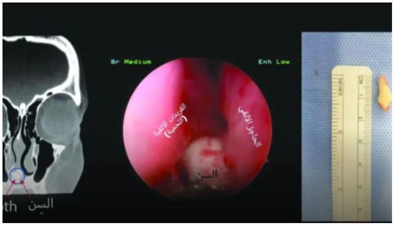 പരിശോധനയില് മൂക്കിനുള്ളില് പല്ല് പോലെയുള്ള എന്തോ വസ്തു ഉള്ളതായി കണ്ടെത്തുകയായിരുന്നു. മൂക്കിലെ ദ്വാരത്തിന് നടുവിലായാണ് ഇതിന്റെ സ്ഥാനമെന്നും വ്യക്തമായി. തുടര്ന്ന് ഒപ്റ്റിക്കല് ഫൈബര് സാങ്കേതിക വിദ്യ ഉപയോഗിച്ച് ഒരു മണിക്കൂറോളം നീണ്ട പരിശ്രമത്തിനൊടുവിലാണ് പല്ല് നീക്കം ചെയ്തത്. മറ്റ് പ്രശ്നങ്ങളൊന്നുമില്ലാതെ പല്ല് നീക്കം ചെയ്യാന് കഴിഞ്ഞെന്നും രോഗിയുടെ ആരോഗ്യസ്ഥിതി മെച്ചപ്പെട്ടെന്നും പ്രൊഫസര് ഹസ്സന് പറഞ്ഞു. ഇത്തരത്തില് സൂപ്പര്ന്യൂമെററി ടൂത്ത് എന്നറിയപ്പെടുന്ന പല്ല് ലോകത്ത് 100 മുതല് 1000 പേരില് ഒരാള്ക്ക് മാത്രമാണ് കാണപ്പെടുന്നതെന്നും അതില് തന്നെ മൂക്കില് പല്ല് വളരുന്ന അവസ്ഥ അപൂര്വ്വമാണെന്നും അദ്ദേഹം കൂട്ടിച്ചേര്ത്തു.