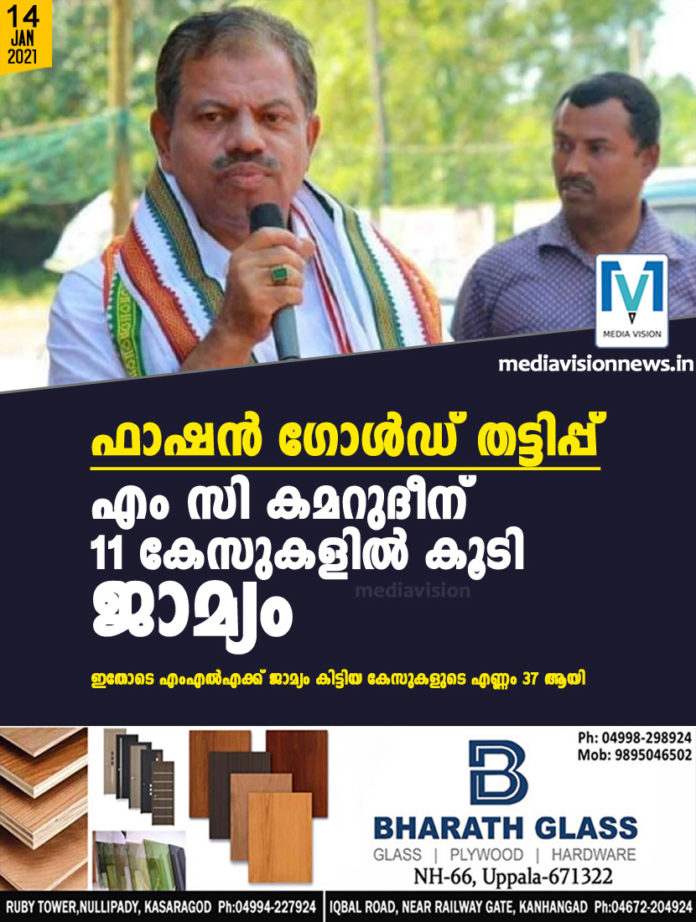 കാസര്കോട്: ഫാഷൻ ഗോൾഡ് നിക്ഷേപ തട്ടിപ്പ് കേസില് മഞ്ചേശ്വരം എംഎൽഎ എം സി കമറുദീന് കൂടുതൽ കേസുകളിൽ ജാമ്യം അനുവദിച്ചു. 11 വഞ്ചന കേസുകളിൽ കൂടി എംഎൽഎക്ക് ജാമ്യം ലഭിച്ചത്. കാസർകോട് ഒന്നാം ക്ലാസ് മജിസ്ടേറ്റ് കോടതിയാണ് ജാമ്യം അനുവദിച്ചത്. ഇതോടെ എംഎൽഎക്ക് ജാമ്യം കിട്ടിയ കേസുകളുടെ എണ്ണം 37 ആയി. എന്നാല്, വേറെയും കേസുകൾ ഉള്ളതിനാൽ എംഎൽഎയ്ക്ക് പുറത്തിറങ്ങാനാകില്ല.