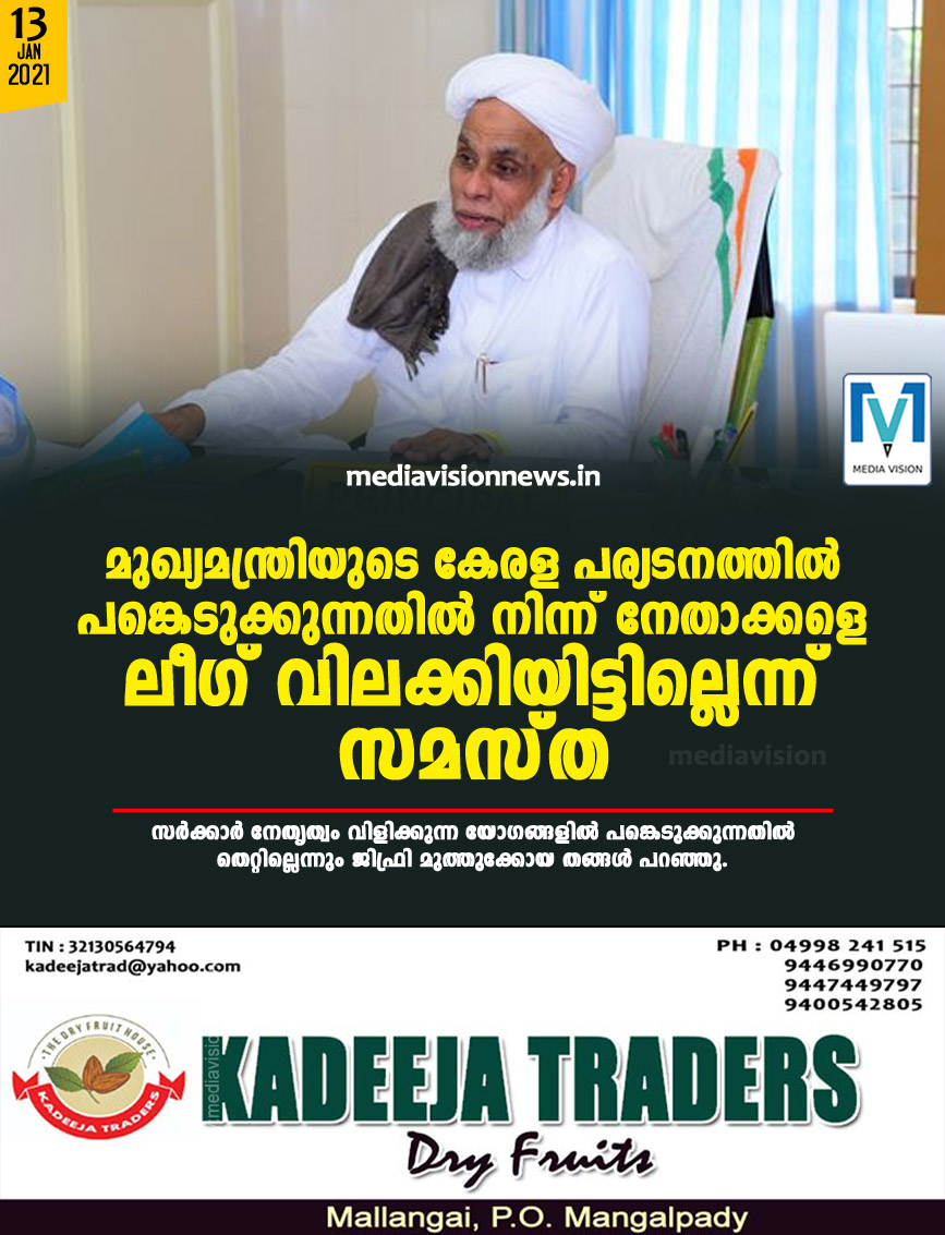 ലീഗുമായി ഒരു തരത്തിലുള്ള അഭിപ്രായഭിന്നതയുമില്ലെന്ന് ജിഫ്രി മുത്തുക്കോയ തങ്ങൾ പറയുന്നു. അതേസമയം, പിണറായി സർക്കാരും സമസ്തയ്ക്ക് വേണ്ടി കാര്യങ്ങൾ ചെയ്ത് തന്നിട്ടുണ്ട്. സമസ്തയുടേത് സ്വതന്ത്രനിലപാടാണ്. ജമാഅത്തെ ഇസ്ലാമിയുടെ രാഷ്ട്രീയപാർട്ടിയായ വെൽഫെയർ പാർട്ടിയെക്കുറിച്ച് സമസ്ത അംഗമായ ഉമ്മർ ഫൈസി മുക്കം പറഞ്ഞത് അദ്ദേഹത്തിന്റെ വ്യക്തിപരമായ നിലപാടാണ്. രാഷ്ട്രീയപാർട്ടികൾക്ക് ആർക്കും ആരോടും കൂട്ടുകൂടാം, സഖ്യം ചേരാം. അത് സമസ്തയുടെ വിഷയമല്ലെന്നും തങ്ങൾ പറയുന്നു.