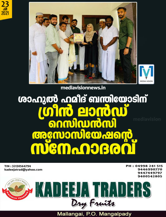 മംഗൽപാടി പഞ്ചായത്ത് പ്രസിഡണ്ട് റിഷാന സാബിർ ഗ്രീൻ ലാൻഡ് റെസിഡൻസി അംഗങ്ങളുടെ സാന്നിദ്ധ്യത്തിൽ ശാഹുൽ ഹമീദ്ന് മൊമെന്റോ കൈമാറി. ശേഷം മംഗൽപാടി പഞ്ചായത്ത് വൈസ് പ്രഡിഡന്റ് യൂസഫ് ഹേരൂർ പൊന്നാട അണിയിച്ചു ആദരിച്ചു. ചടങ്ങിൽ ജില്ലാ പഞ്ചായത്ത് മെമ്പർ ഗോൾഡൻ റഹ്മാൻ യൂത്ത് ലീഗ് മണ്ഡലം സെക്രെട്ടറി മുസ്തഫ, കാദർ ബന്ദിയോട്, ഹനീഫ് കെ.കെ, മുഹമ്മദ് ബേങ്കര, മഹ്മൂദ് ബന്ദിയോട്, ബഷീർ, നാസർ ഗ്രീൻലാൻഡ് എന്നിവർ സംബന്ധിച്ചു.