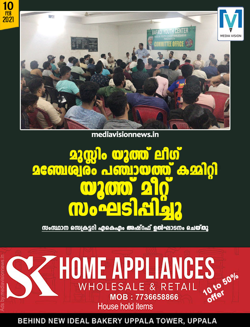 മഞ്ചേശ്വരം: നിയമസഭാ തെരഞ്ഞെടുപ്പിൽ പ്രവർത്തകരെ സജ്ജമാക്കാൻ മുസ്ലിം യൂത്ത് ലീഗ് മഞ്ചേശ്വരം പഞ്ചായത്ത് കമ്മിറ്റിയുടെ ആഭിമുഖ്യത്തിൽ യൂത്ത് മീറ്റ് സംഘടിപ്പിച്ചു. യൂത്ത് ലീഗ് സംസ്ഥാന സെക്രട്ടറി എകെഎം അഷ്റഫ് ഉൽഘാടനം ചെയ്തു.