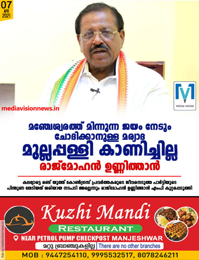 മാര്ക്സിസ്റ്റ് കേന്ദ്രങ്ങളില് അസാധാരണമായ നിര്വികാരതയും മ്ലാനതയും കാണാന് സാധിച്ചു. സ്ഥാനാര്ഥിയെ വിജയിപ്പിക്കാന് വേണ്ടി പാര്ട്ടി പ്രവര്ത്തകന്മാര് സജീവമായി രംഗത്തിറങ്ങാറുണ്ടെന്നും അത്തരത്തിലൊന്ന് മഞ്ചേശ്വരത്ത് ഉണ്ടായില്ലെന്നും മുല്ലപ്പള്ളി പറഞ്ഞു.