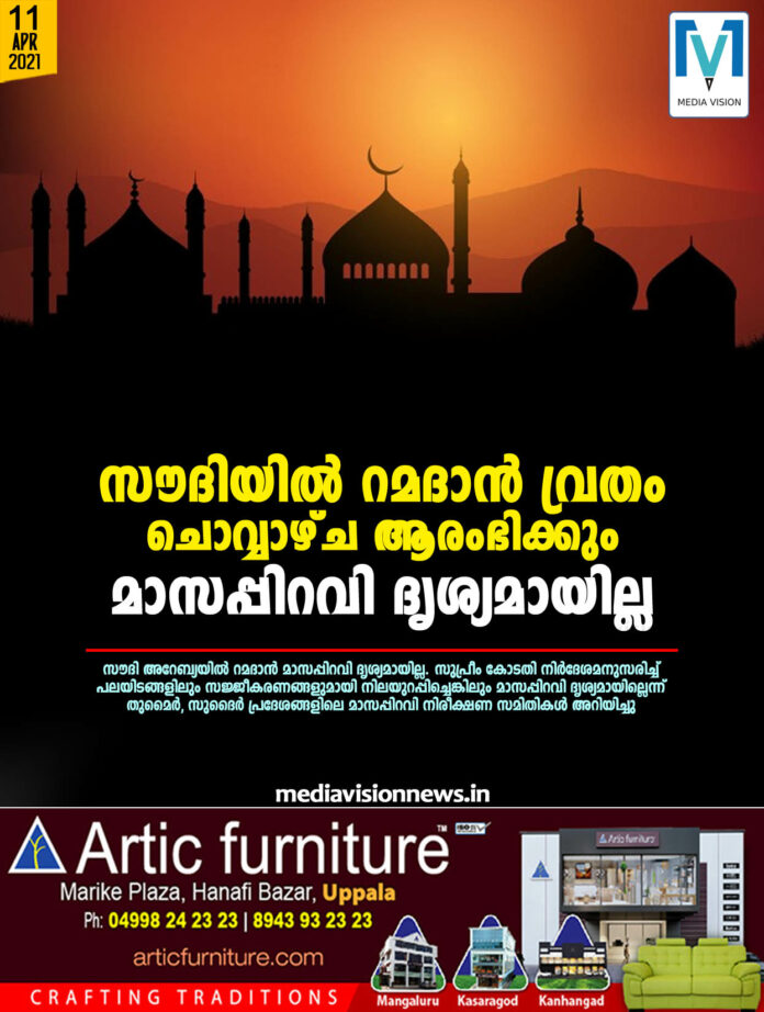 റിയാദ്- സൗദി അറേബ്യയില് റമദാന് മാസപ്പിറവി ദൃശ്യമായില്ല. സുപ്രീം കോടതി നിര്ദേശമനുസരിച്ച് പലയിടങ്ങളിലും സജ്ജീകരണങ്ങളുമായി നിലയുറപ്പിച്ചെങ്കിലും മാസപ്പിറവി ദൃശ്യമായില്ലെന്ന് തുമൈര്, സുദൈര് പ്രദേശങ്ങളിലെ മാസപ്പിറവി നിരീക്ഷണ സമിതികള് അറിയിച്ചു. ഇത് സംബന്ധിച്ച് ഇത് സംബന്ധിച്ച് സുപ്രീം കോടതിയുടേയും റോയൽ കോർട്ടിന്റെയും അറിയിപ്പുകൾ അറിയിപ്പുകള് വൈകാതെ പുറത്തിറക്കും.