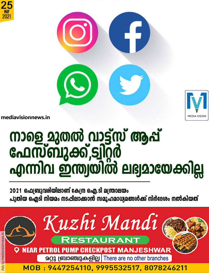 നാളെ മുതൽ വാട്ട്സ് ആപ്പ്, ഫേസ്ബുക്ക്, ട്വിറ്റർ എന്നിവ ഇന്ത്യയിൽ ലഭ്യമായേക്കില്ല. കേന്ദ്ര സർക്കാർ മുന്നോട്ടുവച്ച മാർഗ നിർദേശങ്ങൾക്കനുസരിച്ച് ഫേസ്ബുക്ക് അടക്കമുള്ള സമൂഹമാധ്യമങ്ങൾ നയം മാറ്റാത്തതാണ് ഇന്ത്യയിലെ നിരോധനത്തിന് കാരണം. ഇന്നാണ് വാട്ട്സ് ആപ്പ്, ഫോസ്ബുക്ക്, ട്വിറ്റർ എന്നീ സമൂഹമാധ്യമങ്ങൾക്ക് കേന്ദ്രസർക്കാർ നിർദേശം നടപ്പിലാക്കാനുള്ള അവസാന ദിവസം. ഇന്ന് നിലപാട് മാറ്റിയില്ലെങ്കിൽ ഇന്ത്യയിൽ ഈ പ്ലാറ്റ്ഫോമുകൾ ഉപയോഗിക്കാൻ സാധിക്കില്ലെന്നാണ് റിപ്പോർട്ട്.