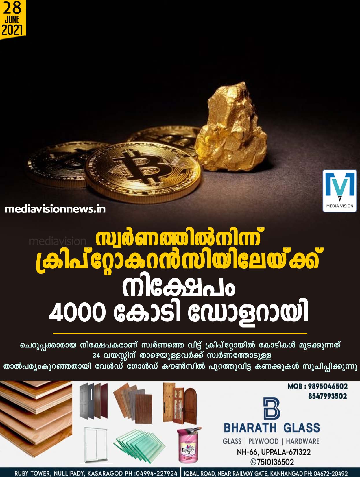 പരമ്പരാഗത നിക്ഷേപമാർഗമായ സ്വർണത്തിൽനിന്ന് നിക്ഷേപകർ വൻതോതിൽ ക്രിപ്റ്റോകറൻസിയിലേയ്ക്ക് കൂടുമാറുന്നതായി റിപ്പോർട്ട്. ലോകത്തിലെതന്നെ ഏറ്റവുംകൂടുതൽ സ്വർണനിക്ഷേപമുള്ള(25,000ടൺ)രാജ്യമാണ് ഇന്ത്യ. കഴിഞ്ഞവർഷം 20 കോടി ഡോളറിൽനിന്ന് ക്രിപ്റ്റോയിലെ നിക്ഷേപം 4000 കോടി ഡോളറായി ഉയർന്നുവെന്ന്, ക്രിപ്റ്റോകറൻസികൾക്കായി സോഫ്റ്റ് വെയർ സേവനം ഉൾപ്പടെയുളളവ നൽകുന്ന സ്ഥാപനമായ ചെയിനലാസിസ് പറയുന്നു.