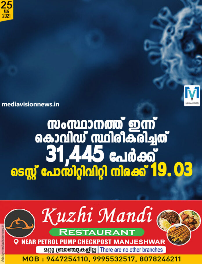 തിരുവനന്തപുരം: സംസ്ഥാനത്ത് ഇന്ന് 31,445 പേര്ക്ക് കോവിഡ്-19 സ്ഥിരീകരിച്ചു. എറണാകുളം 4048, തൃശൂര് 3865, കോഴിക്കോട് 3680, മലപ്പുറം 3502, പാലക്കാട് 2562, കൊല്ലം 2479, കോട്ടയം 2050, കണ്ണൂര് 1930, ആലപ്പുഴ 1874, തിരുവനന്തപുരം 1700, ഇടുക്കി 1166, പത്തനംതിട്ട 1008, വയനാട് 962, കാസര്ഗോഡ് 619 എന്നിങ്ങനേയാണ് ജില്ലകളില് ഇന്ന് രോഗ ബാധ സ്ഥിരീകരിച്ചത്.