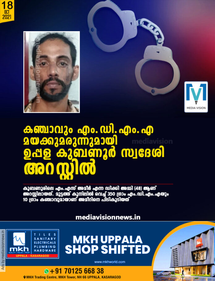 ഉപ്പള: കഞ്ചാവും എം.ഡി.എം.എ. മയക്കുമരുന്നുമായി കുബനൂര്‍ സ്വദേശിയെ കാസര്‍കോട് എക്‌സൈസ് സംഘം അറസ്റ്റ് ചെയ്തു. കുബണൂരിലെ എം.എസ് അമീര്‍ എന്ന ഡിക്കി അമ്മി (48) ആണ് അറസ്റ്റിലായത്. മുട്ടത്ത് കുനിലില്‍ വെച്ച് 350 ഗ്രാം എം.ഡി.എം.എയും 10 ഗ്രാം കഞ്ചാവുമായാണ് അമീറിനെ പിടികൂടിയത്. ആവശ്യക്കാര്‍ക്ക് മയക്കുമരുന്നു കൈ മാറാന്‍ എത്തിയതായിരുന്നു. എക്‌സൈസ് സര്‍ക്കിള്‍ ഇന്‍സ്‌പെക്ടര്‍ ടോണി ഐസക്ക്, പ്രിവന്റീവ് ഓഫീസര്‍മാരായ രാജീവ്, ദിവാക്കരന്‍, സിവില്‍ എക്‌സൈസ് ഓഫീസര്‍മാരായ എം.പി. മഹേഷ് കുമാര്‍, കെ.സതീഷന്‍, സുധീഷന്‍, ഹമീദ്, സബിത്ത്‌ലാല്‍, ഷിജേഷ്, ഡ്രൈവര്‍ സത്യന്‍ എന്നിവര്‍ ചേര്‍ന്നാണ് പരിശോധന നടത്തിയത്.
