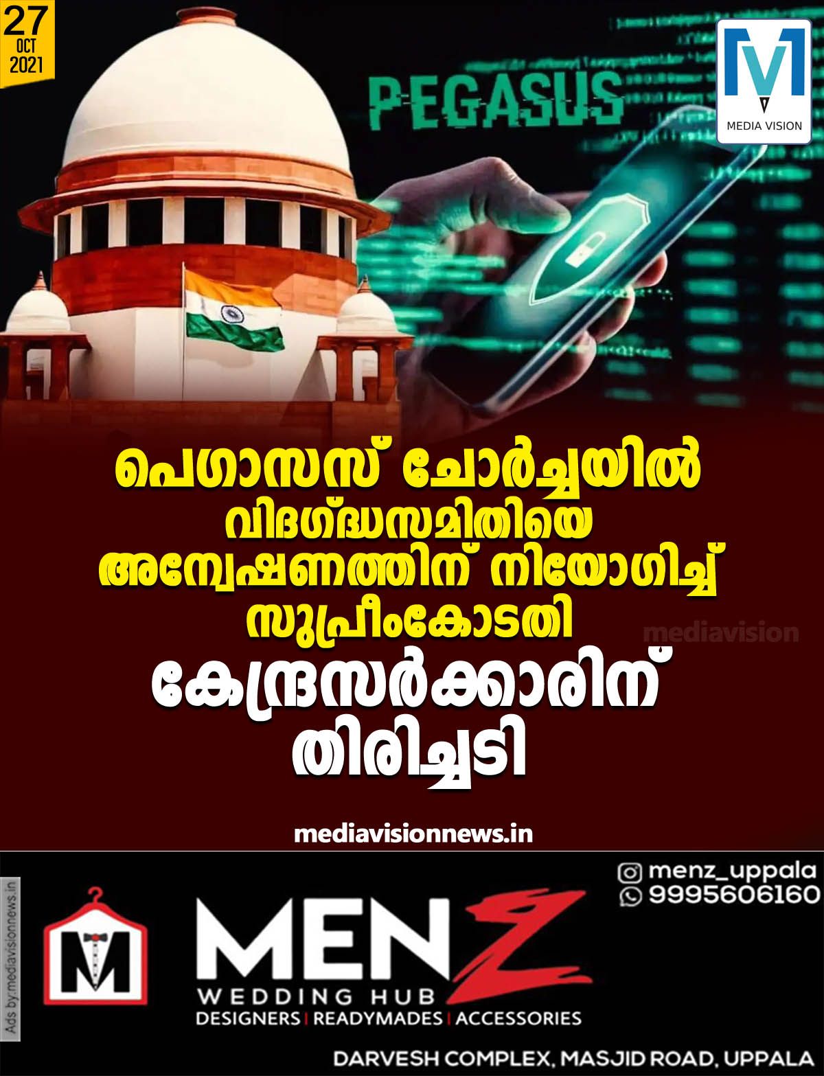 പെഗാസസ് ചോർച്ചയുമായി ബന്ധപ്പെട്ട ഏഴ് വിഷയങ്ങളാവും വിദഗ്ദ്ധ സമിതി അന്വേഷിക്കുക. കേന്ദ്രസർക്കാർ സമിതിയുമായി സഹകരിക്കണമെന്നും സുപ്രീംകോടതി വിധിയിലുണ്ട്. ചീഫ് ജസ്റ്റിസ് എൻ.വി.രമണ അധ്യക്ഷനായ ബെഞ്ചാണ് കേസിൽ വിധി പറഞ്ഞത്. വിധി പ്രസ്താവത്തിൽ കേന്ദ്രസർക്കാരിനെതിരെ കോടതി വിമർശനമുന്നയിച്ചു. സുരക്ഷയുടെ പേരും പറഞ്ഞ് എന്തും ചെയ്യുന്നത് അംഗീകരിക്കാനാവില്ലെന്നും കേസുമായി ബന്ധപ്പെട്ട് വളരെ കുറച്ച് വിവരങ്ങൾ മാത്രമാണ് കോടതിക്ക് കേന്ദ്രത്തിൽ നിന്നും ലഭിച്ചതെന്നും സുപ്രീംകോടതി വിമർശിച്ചു.