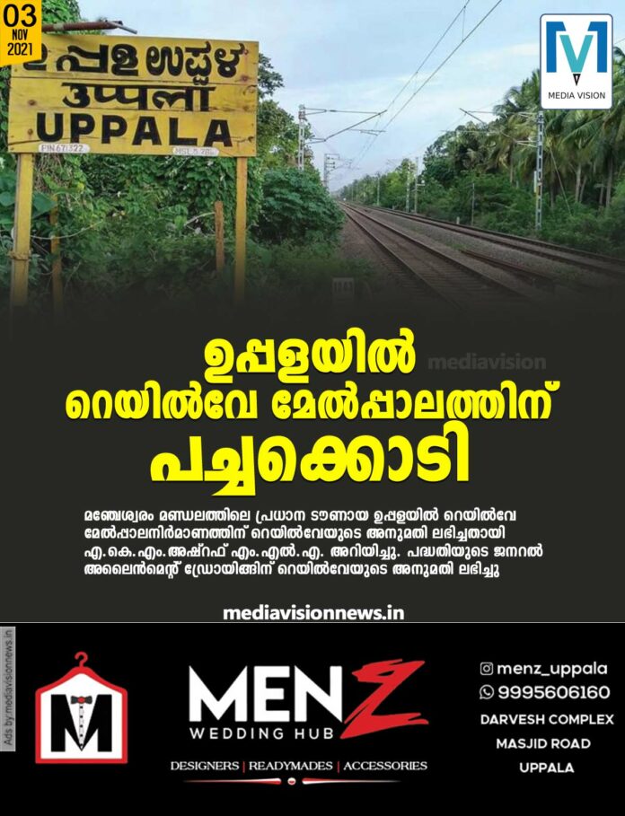 ഉപ്പള: മഞ്ചേശ്വരം മണ്ഡലത്തിലെ പ്രധാന ടൗണായ ഉപ്പളയിൽ റെയിൽവേ മേൽപ്പാലനിർമാണത്തിന് റെയിൽവേയുടെ അനുമതി ലഭിച്ചതായി എ.കെ.എം.അഷ്റഫ് എം.എൽ.എ. അറിയിച്ചു. പദ്ധതിയുടെ ജനറൽ അലൈൻമെന്റ് ഡ്രോയിങ്ങിന് റെയിൽവേയുടെ അനുമതി ലഭിച്ചു.