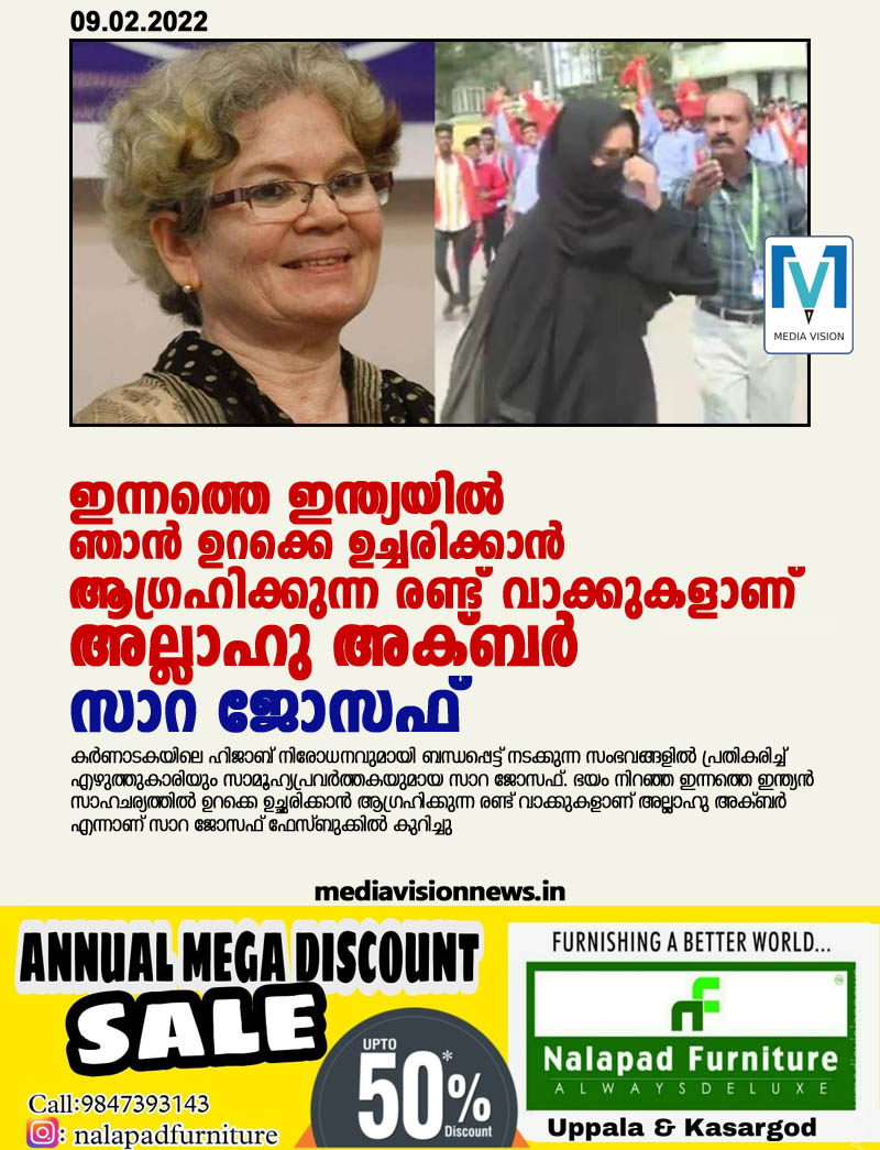 പെണ്‍കുട്ടി ‘അല്ലാഹു അക്ബര്‍’ എന്ന് വിളിക്കുന്ന ദൃശ്യം മാത്രമായി മുറിച്ചെടുത്ത് വിദ്വേഷ പ്രചാരണവും സാമൂഹിക മാധ്യമങ്ങളില്‍ നടക്കുന്നുണ്ട്. ഈ സാഹചര്യത്തിലാണ് സാറാ ജോസഫിന്റെ പ്രതികരണം.