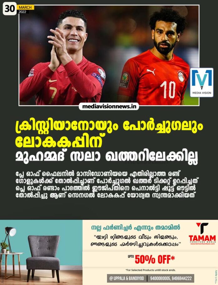 പ്ലെ ഓഫ് രണ്ടാം പാദത്തില് ഈജിപ്തിനെ പെനാല്ട്ടി ഷൂട്ട് ഔട്ടില് തോല്പ്പിച്ചു ആണ് സെനഗല് ലോകകപ്പ് യോഗ്യത സ്വന്തമാക്കിയത്. ആഫ്രിക്കന് നേഷന്സ് കപ്പിലെ ഫൈനല് ആവര്ത്തനത്തില് വീണ്ടും പെനാല്ട്ടി ഷൂട്ട് ഔട്ടില് ഈജിപ്തിന് കണ്ണീര്. സൂപ്പര്താരം മുഹമ്മദ് സലാ പെനാല്റ്റി പുറത്തേക്കടിച്ചു.