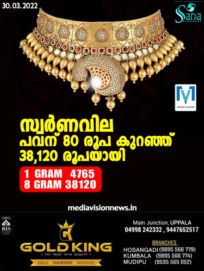 ഇന്നത്തെ സ്വർണവില ഗ്രാമിന് (22 കാരറ്റ്) 4765 രൂപയാണ്. ഒരു പവന്റെ വില 38120 രൂപയിലേക്ക് താഴ്ന്നു. 18 കാരറ്റ് സ്വർണത്തിന്റെ വിലയിലും സമാനമായ കുറവുണ്ടായി. 10 രൂപയാണ് ഗ്രാമിന് കുറഞ്ഞത്. ഇന്നത്തെ വില ഗ്രാമിന് 3935 രൂപയാണ്. ഹോൾമാർക്ക് വെള്ളിയുടെ വില 100 രൂപയാണ് ഗ്രാമിന്. വെള്ളിയുടെ വില കുറഞ്ഞു. ഗ്രാമിന് രണ്ട് രൂപ കുറഞ്ഞ് 72 രൂപയിലാണ് വെള്ളിയുടെ വിപണനം.