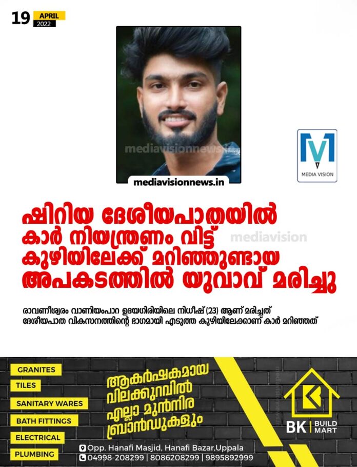Home Latest news ഷിറിയ ദേശീയപാതയില് കാര് നിയന്ത്രണം വിട്ട് കുഴിയിലേക്ക് മറിഞ്ഞുണ്ടായ അപകടത്തില് യുവാവ് മരിച്ചു
