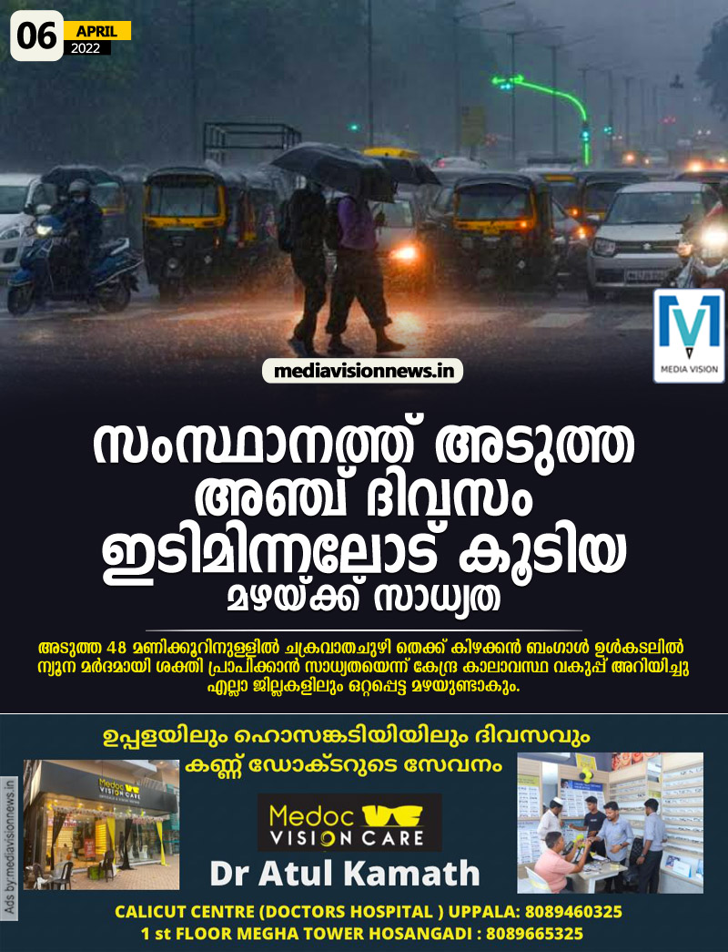 അടുത്ത 48 മണിക്കൂറിനുള്ളിൽ ചക്രവാതചുഴി തെക്ക് കിഴക്കൻ ബംഗാൾ ഉൾകടലിൽ ന്യൂന മർദമായി ശക്തി പ്രാപിക്കാൻ സാധ്യതയെന്ന് കേന്ദ്ര കാലാവസ്ഥ വകുപ്പ് അറിയിച്ചു. എല്ലാ ജില്ലകളിലും ഒറ്റപ്പെട്ട മഴയുണ്ടാകും.