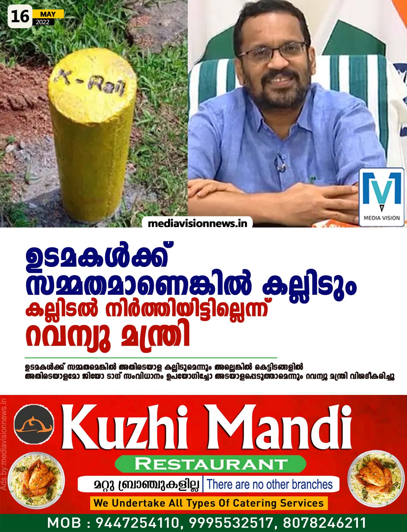 ഉടമകള്‍ക്ക് സമ്മതമാണെങ്കില്‍ കല്ലിടും; കല്ലിടല്‍ നിര്‍ത്തിയിട്ടില്ലെന്ന് റവന്യു മന്ത്രി