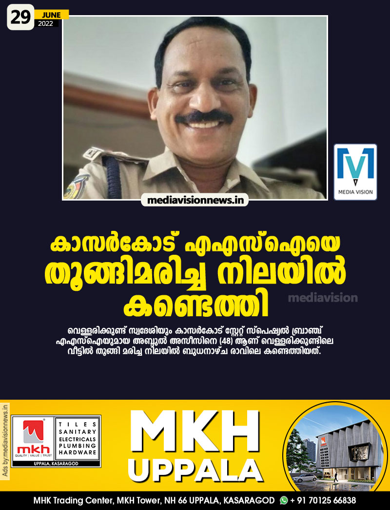 കാസർകോട് ∙ സ്പെഷൽ ബ്രാഞ്ച് എഎസ്ഐയെ തൂങ്ങിമരിച്ച നിലയിൽ കണ്ടെത്തി. പരപ്പ സ്വദേശി അബ്ദുൽ അസീസാണ് മരിച്ചത്. കുടുംബ പ്രശ്നങ്ങളാണ് ആത്മഹത്യയ്ക്കു കാരണമെന്നാണ് പ്രാഥമിക നിഗമനം. ഇൻക്വസ്റ്റ് നടപടികൾക്കു ശേഷം പോസ്റ്റ്മോർട്ടത്തിനായി മൃതദേഹം ആശുപത്രിയിലേക്കു മാറ്റും.