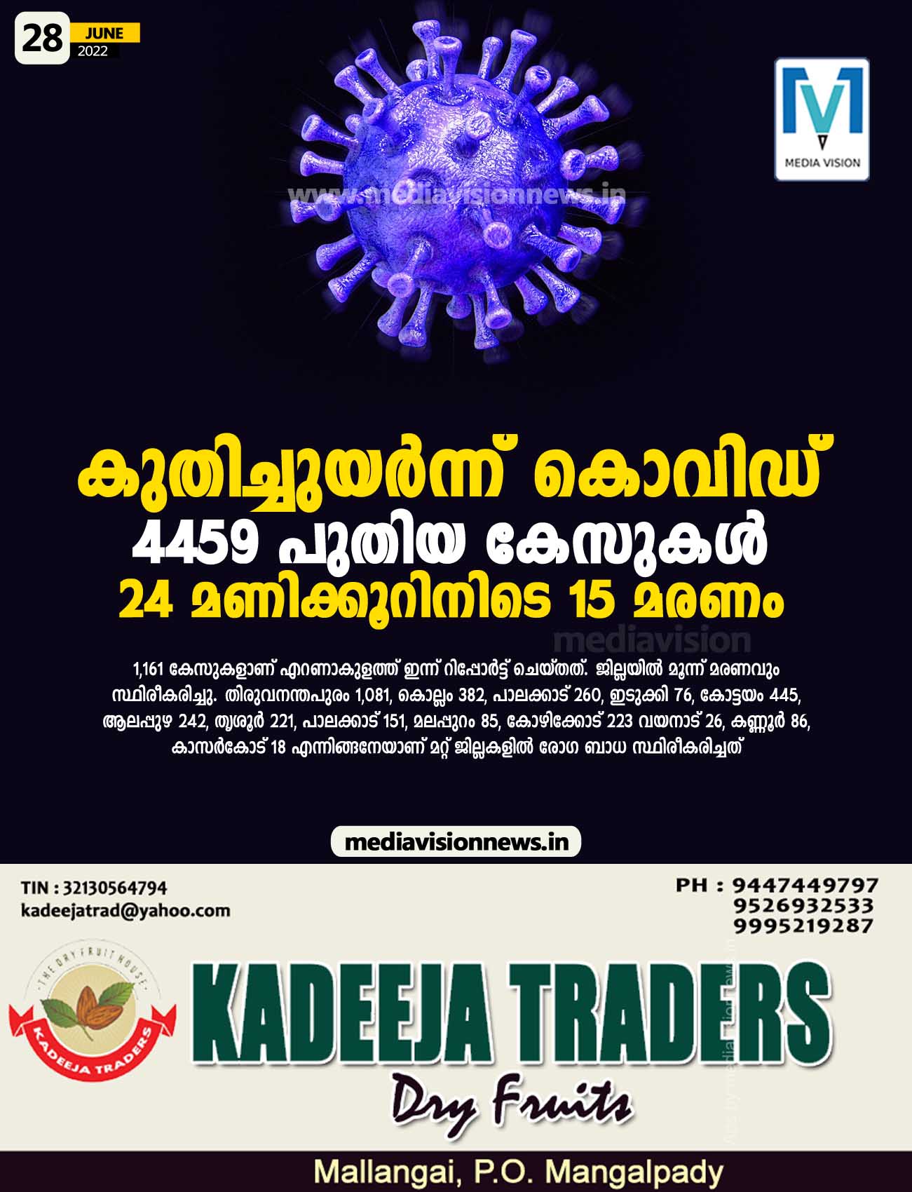 തിരുവനന്തപുരം: സംസ്ഥാനത്ത് കൊവിഡ് (Covid) കേസുകൾ വീണ്ടും കൂടി. ഇന്ന് 4,459 പേർക്ക് കൊവിഡ് സ്ഥിരീകരിച്ചത്. 24 മണിക്കൂറിനിടെ കൊവിഡ് മൂലം 15 മരണവും സ്ഥിരീകരിച്ചു. ഇന്ന് ഏറ്റവും കൂടുതൽ കൊവിഡ് കേസുകള് സ്ഥിരീകരിച്ചത് എറണാകുളത്താണ്. 1,161 കേസുകളാണ് എറണാകുളത്ത് ഇന്ന് റിപ്പോര്ട്ട് ചെയ്തത്. ജില്ലയില് മൂന്ന് മരണവും സ്ഥിരീകരിച്ചു.