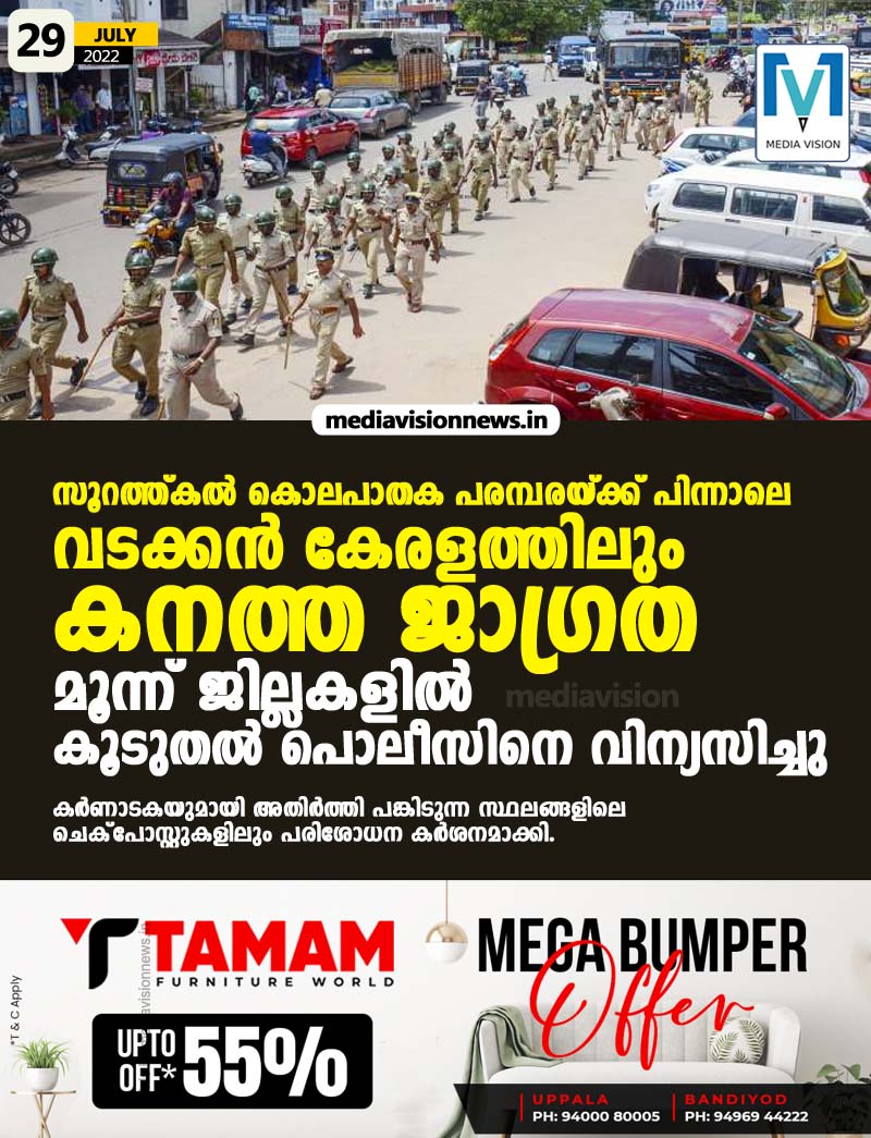 സൂറത്ത്കൽ കൊലപാതക പരമ്പരയ്ക്ക് പിന്നാലെ വടക്കൻ കേരളത്തിലും കനത്ത ജാഗ്രത, മൂന്ന് ജില്ലകളിൽ കൂടുതൽ പൊലീസിനെ വിന്യസിച്ചു