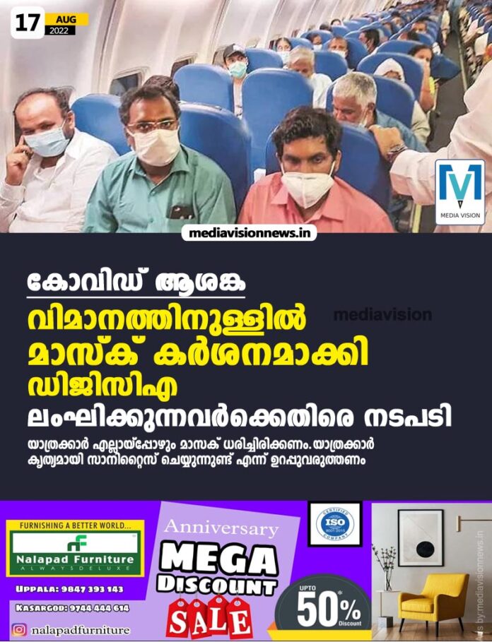വിമാന കമ്പനികള് മാര്ഗനിര്ദേശം കൃത്യമായി പാലിക്കുന്നുണ്ടോ എന്ന് ഉറപ്പുവരുത്താന് പരിശോധന നടത്തും. യാത്രക്കാര് എല്ലായ്പ്പോഴും മാസക് ധരിച്ചിരിക്കണം. യാത്രക്കാര് കൃത്യമായി സാനിറ്റൈസ് ചെയ്യുന്നുണ്ട് എന്ന് ഉറപ്പുവരുത്തണം. കോവിഡ് പ്രോട്ടോക്കോള് പാലിക്കാന് യാത്രക്കാരില് ആരെങ്കിലും തയ്യാറായില്ലെങ്കില് വിമാന കമ്പനികള് അവര്ക്കെതിരെ നടപടി സ്വീകരിക്കണമെന്നും ഡിജിസിഎ നിര്ദേശിച്ചു.