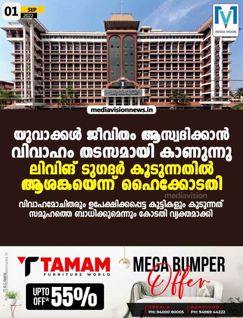 കൊച്ചി: ജീവിതം ആസ്വദിക്കുന്നതിന് തടസമായി പുതിയ തലമുറ വിവാഹത്തെ കാണുന്നുവെന്ന് ഹൈക്കോടതി. എപ്പോൾ വേണമെങ്കിലും ഉപേക്ഷിക്കാവുന്ന ലിവിംഗ് ടുഗദർ കൂടുന്നുവെന്നും കോടതി നിരീക്ഷിച്ചു. വിവാഹമോചിതരും ഉപേക്ഷിക്കപ്പെട്ട കുട്ടികളും കൂടുന്നത് സമൂഹത്തെ ബാധിക്കുമെന്നും കോടതി വ്യക്തമാക്കി.