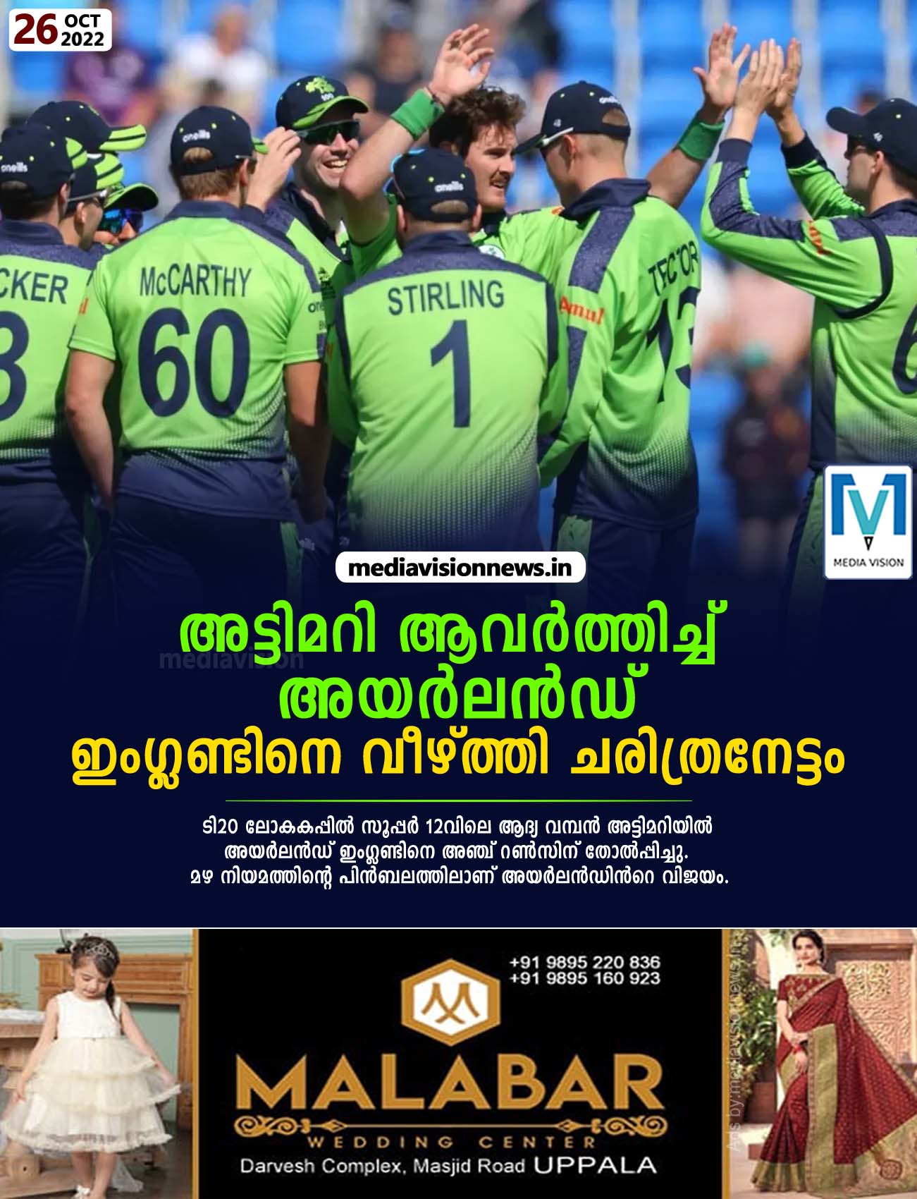 മെല്ബണ്: ടി20 ലോകകപ്പില് സൂപ്പര് 12വിലെ ആദ്യ വമ്പന് അട്ടിമറിയില് അയര്ലന്ഡ് ഇംഗ്ലണ്ടിനെ അഞ്ച് റണ്സിന് തോല്പ്പിച്ചു. മഴ നിയമത്തിന്റെ പിന്ബലത്തിലാണ് അയര്ലന്ഡിന്റെ വിജയം. ആദ്യം ബാറ്റ് ചെയ്ത അയര്ലന്ഡ് 19.2 ഓവറില് 157 റണ്സിന് ഓള് ഔട്ടായപ്പോള് ഇംഗ്ലണ്ട് 14.3 ഓവറില് അഞ്ച് വിക്കറ്റ് നഷ്ടത്തില് 105 റണ്സെടുത്തു നില്ക്കെ മഴ മൂലം മത്സരം നിര്ത്തിവെച്ചു. പിന്നീട് മത്സരം തുടരാനാവാതെ വന്നതോടെ ഡക്വര്ത്ത് ലൂയിസ് നിയമപ്രകാരം അയര്ലന്ഡ് അഞ്ച് റണ്സിന് ജയിച്ചു. മഴ മൂലം കളി നിര്ത്തുമ്പോള് ഡക്വര്ത്ത് ലൂയിസ് നിയമപ്രകാരം ഇംഗ്ലണ്ട് നേടേണ്ട സ്കോറിന് അഞ്ച് രണ്സിന് പിന്നിലായിരുന്നു. സ്കോര് അയര്ലന്ഡ് 19.2 ഓവറില് 157ന് ഓള് ഔട്ട്. ഇംഗ്ലണ്ട് 14.3 ഓവറില് 105-5.