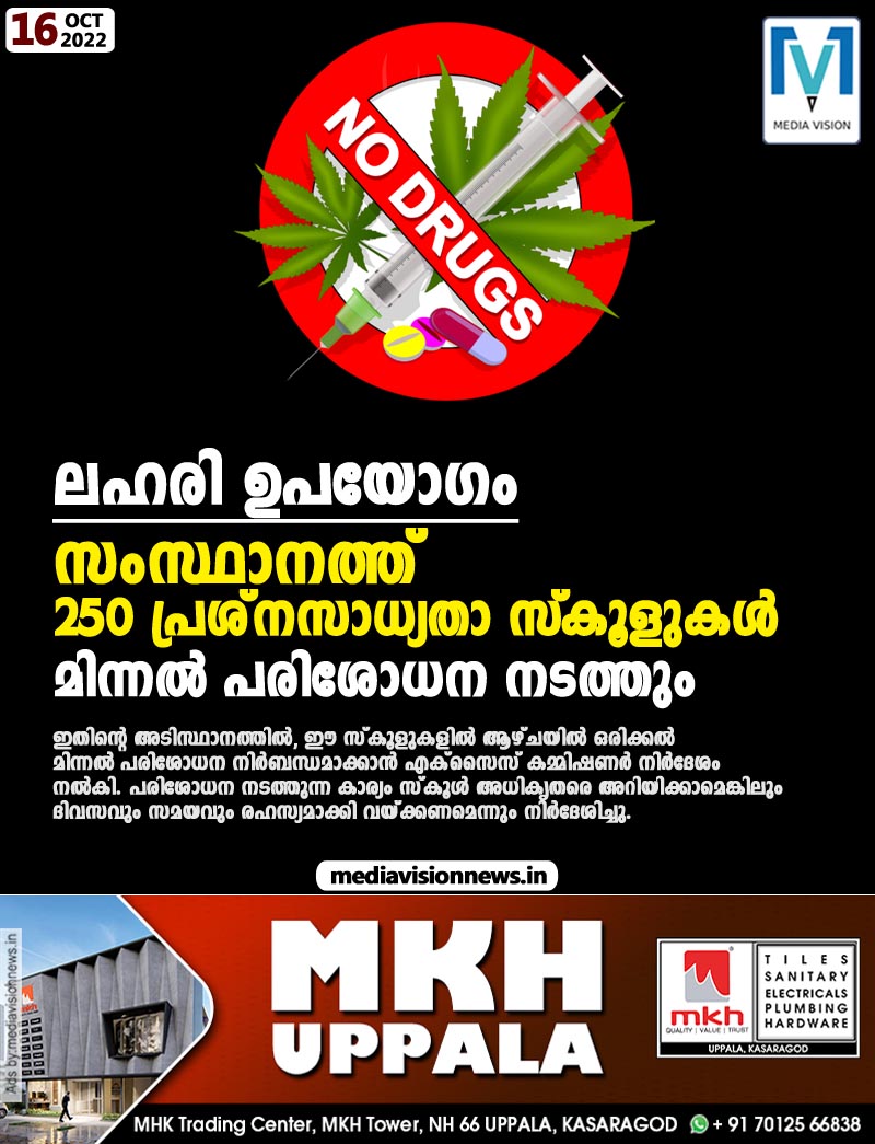 ലഹരി ഉപയോഗം: സംസ്ഥാനത്ത് 250 പ്രശ്നസാധ്യതാ സ്കൂളുകൾ; മിന്നൽ പരിശോധന നടത്തും
