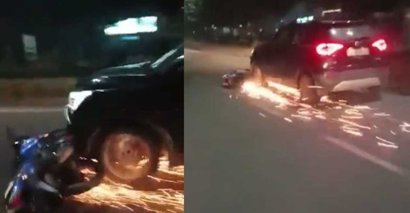 കാറും ബൈക്കും കൂട്ടിയിടിച്ചതിന് പിന്നാലെയാണ് ബൈക്ക് കുരുങ്ങിയത്. ഇതു ശ്രദ്ധിക്കാതെ ഉടമ കാറോടിച്ച് പോവുകയായിരുന്നു. ബൈക്കിന്റെ ലോഹഭാഗങ്ങള്‍ റോഡിലുരഞ്ഞ് തീപ്പൊരി ചിതറിയിട്ടും കാറോടിച്ചയാള്‍ ശ്രദ്ധിച്ചില്ല.