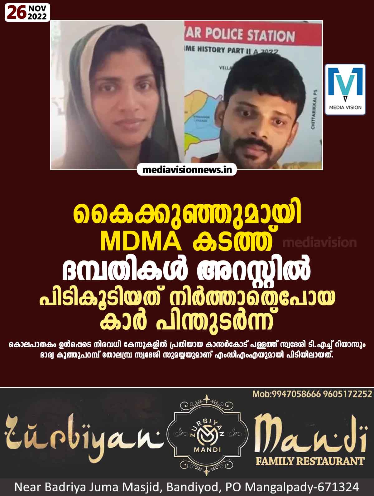 ഒരുവയസ്സുള്ള കുട്ടിയുമായി കാറിലാണ് ഇവര് എംഡിഎംഎ കടത്തിയത്. വെള്ളിയാഴ്ച രാത്രി നീലേശ്വരം കോട്ടപ്പുറത്തുവെച്ച് പോലീസ് കൈ കാണിച്ചിട്ടും റിയാസ് കാര് നിര്ത്താതെ പോവുകയായിരുന്നു. ഇതോടെ വാഹനത്തെ പിന്തുടര്ന്ന് പിടികൂടി പരിശോധിച്ചപ്പോഴാണ് കാറിനുള്ളില് ഒളിപ്പിച്ചിരുന്ന എംഡിഎംഎ കണ്ടെത്തിയത്. പിടികൂടിയ മയക്കുമരുന്നിന് 5.7 ഗ്രാം തൂക്കംവരും.