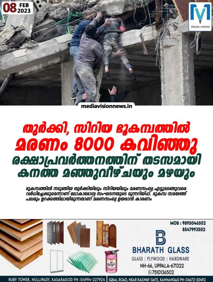 ഭൂകമ്പത്തിൽ നടുങ്ങിയ തുർക്കിയിലും സിറിയയിലും മരണസംഖ്യ എട്ടുമടങ്ങുവരെ വർധിച്ചേക്കുമെന്നാണ് ലോകാരോഗ്യ സംഘടനയുടെ മുന്നറിയിപ്പ്. ഭൂകമ്പ സമയത്ത് പലരും ഉറക്കത്തിലായിരുന്നതാണ് മരണസംഖ്യ ഉയരാൻ കാരണം. ഭൂകമ്പബാധിത പ്രദേശമായ ഗാസിയാൻതെപിൽ താപനില മൈനസ് അഞ്ച് ഡിഗ്രിയാണ്. തുർക്കിയിൽ നിന്ന് മാത്രം എണ്ണായിരത്തിലധികം പേരെ രക്ഷപ്പെടുത്തിട്ടുണ്ട്.