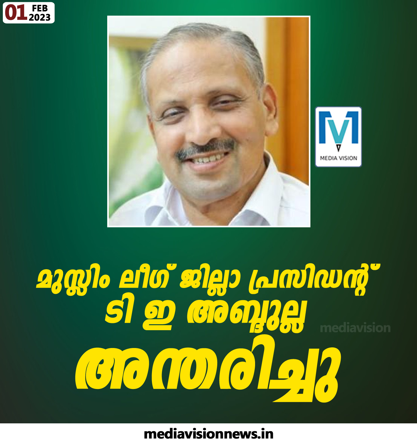 കാസര്കോട്: മുസ്ലിം ലീഗ് കാസര്കോട് ജില്ലാ പ്രസിഡന്റും കാസര്കോട് നഗരസഭ മുന് ചെയര്മാനുമായ തളങ്കര കടവത്തെ ടിഇ അബ്ദുല്ല (65) അന്തരിച്ചു. ഉത്തരകേരളത്തില് മുസ്ലിം ലീഗിന് ജനകീയ മുഖം നല്കിയ മുന് എംഎല്എ പരേതനായ ടിഎ ഇബ്രാഹിമി ന്റെയും സൈനബബി യുടെയും മകനാണ്. എംഎസ്എഫിലൂടെയാണ് പൊതുരംഗത്ത് വരുന്നത്. തളങ്കര മുസ് ലിം ഹൈസ്കൂള് യൂണിറ്റ് എംഎസ്എഫ് പ്രസിഡന്റായിരുന്നു. ഹൈസ്കൂള് ലീഡറായി എതിരില്ലാതെ തിരഞ്ഞെടുക്കപ്പെട്ടിട്ടുണ്ട്. 1978ല് തളങ്കര വാര്ഡ് മുസ് ലിം ലീഗ് സെക്രട്ടറിയായി. അവിഭക്ത കണ്ണൂര് ജില്ലാ മുസ് ലിം ലീഗ് പ്രവര്ത്തക സമിതി അംഗം, കാസര്കോട് മുനിസിപ്പല് യൂത്ത് ലീഗ് വൈസ് പ്രസിഡന്റ്, കാസര്കോട് നിയോജക മണ്ഡലം യൂത്ത് ലീഗ് പ്രസിഡന്റ്, കാസര്കോട് നിയോജക മണ്ഡലം മുസ് ലിം ലീഗ് ജനറല് സെക്രട്ടറി, കാസര്കോട് ജില്ലാ മുസ് ലിം ലീഗ് വൈസ് പ്രസിഡന്റ്, കാസര്കോട് വികസന അതോറിറ്റി ചെയര്മാന് എന്നീ സ്ഥാനങ്ങള് വഹിച്ച ടിഇ അബ്ദുല്ല 2008 മുതല് സംസ്ഥാന മുസ്ലിം ലീഗ് പ്രവര്ത്തക സമിതി അംഗമാണ്. ചെര്ക്കളം അബ്ദുല്ലയുടെ നിര്യാണത്തെ തുടര്ന്നാണ് മുസ്ലിം ലീഗ് ജില്ലാ പ്രസിഡന്റ് സ്ഥാനം ഏറ്റെടുത്തത്. 1988 മുതല് കാസര്കോട് നഗരസഭ കൗണ്സിലറായി.2000 ല് തളങ്കര കുന്നില് നിന്നും 2005ല് തളങ്കര പടിഞ്ഞാറില് നിന്നും എതിരില്ലാതെ തിരഞ്ഞെടുക്കപ്പെട്ടു.