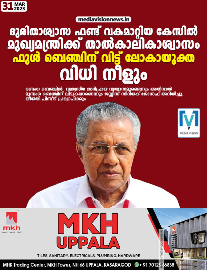 തിരുവനന്തപുരം : ദുരിതാശ്വാസ ഫണ്ട് വകമാറ്റിയെന്ന മുഖ്യമന്ത്രിക്കും ഒന്നാം പിണറായി സർക്കാറിലെ മന്ത്രിമാർക്കുമെതിരായ കേസിൽ മുഖ്യമന്ത്രിക്ക് താൽക്കാലിക ആശ്വാസം. കേസ് മൂന്നംഗ വിശാല ബെഞ്ചിന് വിട്ടു. രണ്ടംഗ ബെഞ്ചിൽ വ്യത്യസ്ത അഭിപ്രായ വ്യത്യാസമുണ്ടെന്നും അതിനാൽ മൂന്നംഗ ബെഞ്ചിന് വിടുകയാണെന്നും ജസ്റ്റിസ് സിറിയക് ജോസഫ് അറിയിച്ചു. തീയതി പിന്നീട് പ്രഖ്യാപിക്കും.