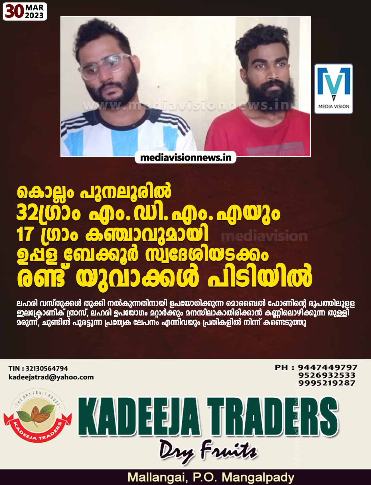 ബംഗളൂരുവിൽ നിന്ന് ഒരുലക്ഷം രൂപയ്ക്കുവാങ്ങിയ ലഹരി വസ്തുക്കൾ, തെങ്കാശി- കൊല്ലം ഫാസ്റ്റ് പാസഞ്ചർ ബസിൽ കടത്തി ക്കൊണ്ട് വരുന്നതിനിടെയാണ് യുവാക്കൾ പിടിയിലായത്.