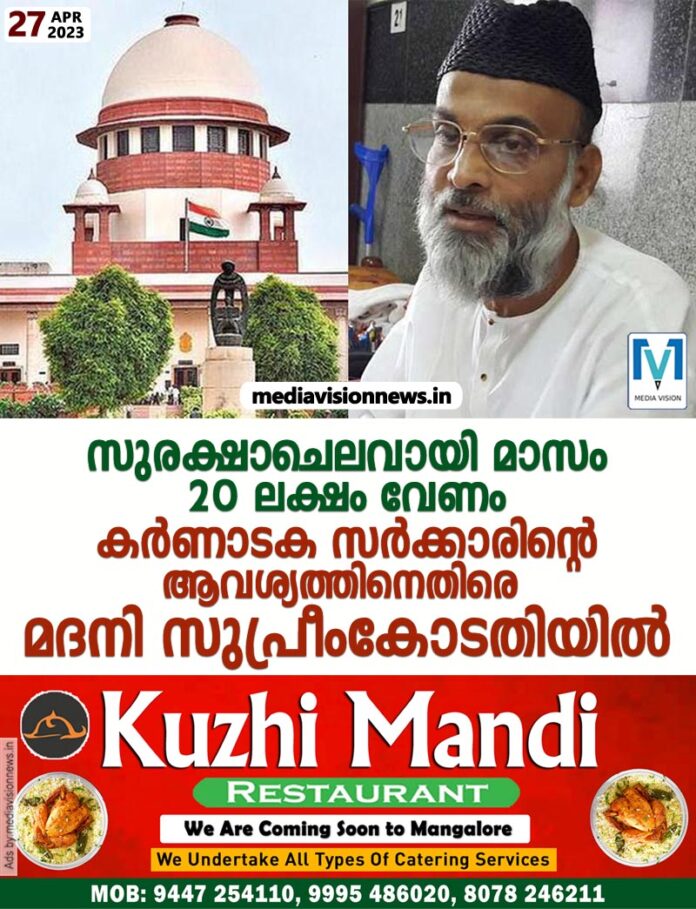 ദില്ലി:കര്ണാടക സര്ക്കാരിനെതിരെ മദനി വീണ്ടും സുപ്രീം കോടതിയിൽ .കേരളത്തിൽ സുരക്ഷ നൽകാൻ കർണാടക സർക്കാർ ഒരു മാസം 20 ലക്ഷം രൂപ ആവശ്യപ്പെട്ടതിനെതിരെയാണ് കോടതിയെ സമീപിച്ചത് .ഹർജി ഇന്ന് കോടതിയിൽ പരാമർശിച്ചു .കർണാടക സർക്കാർ നടപടി കോടതി ഉത്തരവിനെ നീർവീര്യമാക്കുന്നതെന്ന് സുപ്രിം കോടതി നീരീക്ഷിച്ചു..കഴിഞ്ഞ തവണ നാല് ഉദ്യോഗസ്ഥർ വന്നിടത്ത് ഇത്തവണ ഇത് വർധിച്ചത് എങ്ങനെയെന്ന് കോടതി ചോദിച്ചു.വിഷയത്തിൽ മറുപടി സമർപിക്കാൻ കർണാടക സർക്കാരിന് നിർദേശം നല്കി.മദനിയുടെ ഹർജി തിങ്കളാഴ്ച്ച പരിഗണിക്കും.