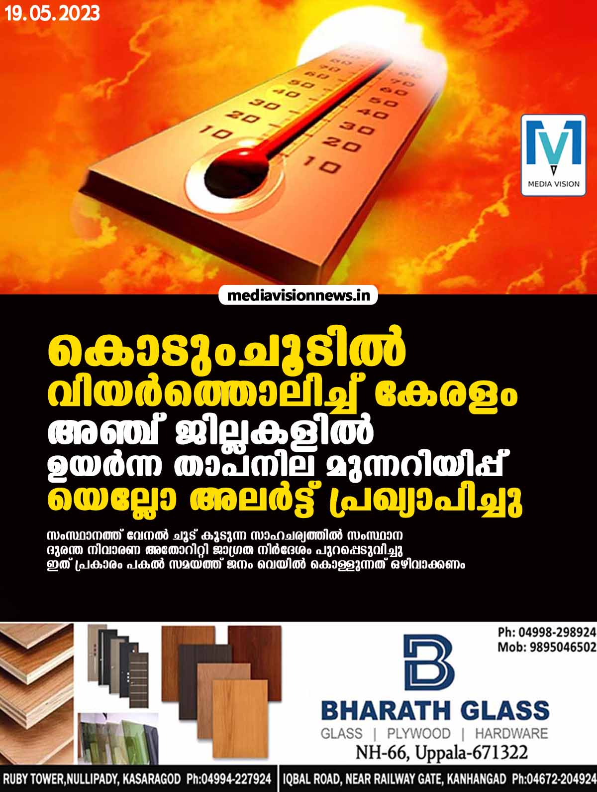 - വേനൽക്കാലത്ത് മാർക്കെറ്റുകൾ, കെട്ടിടങ്ങൾ, മാലിന്യശേഖരണ-നിക്ഷേപ കേന്ദ്രങ്ങൾ (ഡംപിങ് യാർഡ്) തുടങ്ങിയ ഇടങ്ങളിൽ തീപിടുത്തങ്ങൾ വർധിക്കാനും വ്യാപിക്കാനുമുള്ള സാധ്യത കൂടുതലാണ്. ഫയർ ഓഡിറ്റ് നടത്തേണ്ടതും കൃത്യമായ സുരക്ഷാ മുൻകരുതൽ സ്വീകരിക്കുകയും ചെയ്യേണ്ടതാണ്. ഇവയോട് ചേർന്ന് താമസിക്കുന്നവരും സ്ഥാപനങ്ങൾ നടത്തുന്നവരും പ്രത്യേകം ജാഗ്രത പാലിക്കുക.