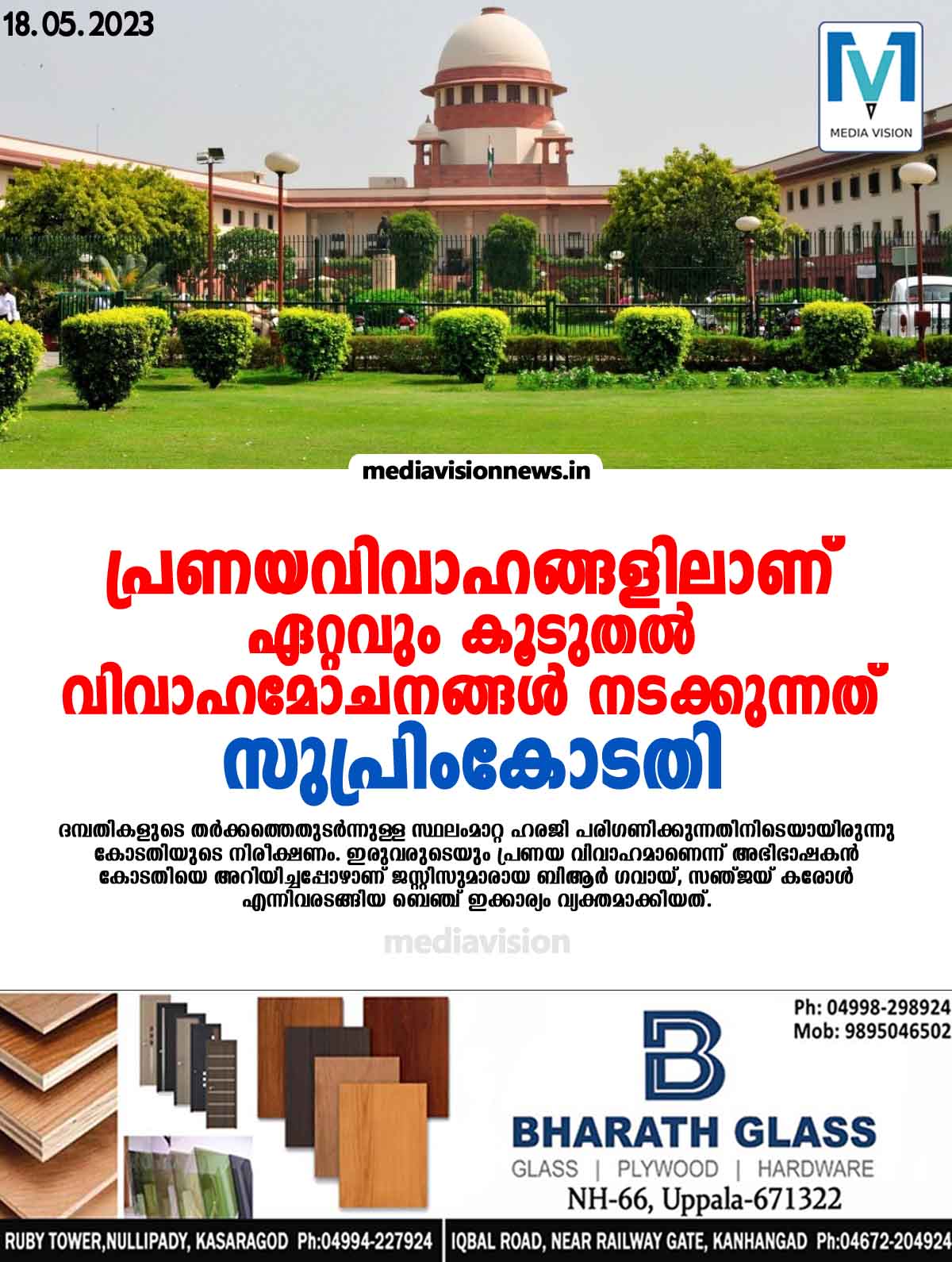 ന്യൂഡൽഹി: രാജ്യത്തെ മിക്ക വിവാഹമോചനങ്ങളും നടക്കുന്നത് പ്രണയവിവാഹങ്ങളിലാണെന്ന് സുപ്രിംകോടതി. ദമ്പതികളുടെ തർക്കത്തെതുടർന്നുള്ള സ്ഥലംമാറ്റ ഹരജി പരിഗണിക്കുന്നതിനിടെയായിരുന്നു കോടതിയുടെ നിരീക്ഷണം. ഇരുവരുടെയും പ്രണയ വിവാഹമാണെന്ന് അഭിഭാഷകൻ കോടതിയെ അറിയിച്ചപ്പോഴാണ് ജസ്റ്റിസുമാരായ ബിആർ ഗവായ്, സഞ്ജയ് കരോൾ എന്നിവരടങ്ങിയ ബെഞ്ച് ഇക്കാര്യം വ്യക്തമാക്കിയത്.