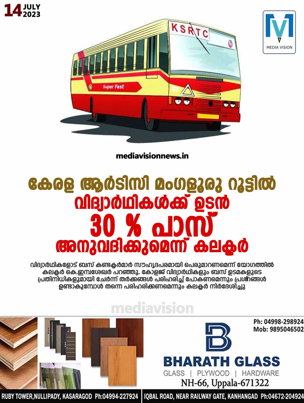 കേരള ആർടിസി മംഗളൂരു റൂട്ടിൽ വിദ്യാർഥികൾക്ക് ഉടൻ 30 % പാസ് അനുവദിക്കുമെന്ന് കലക്ടർ