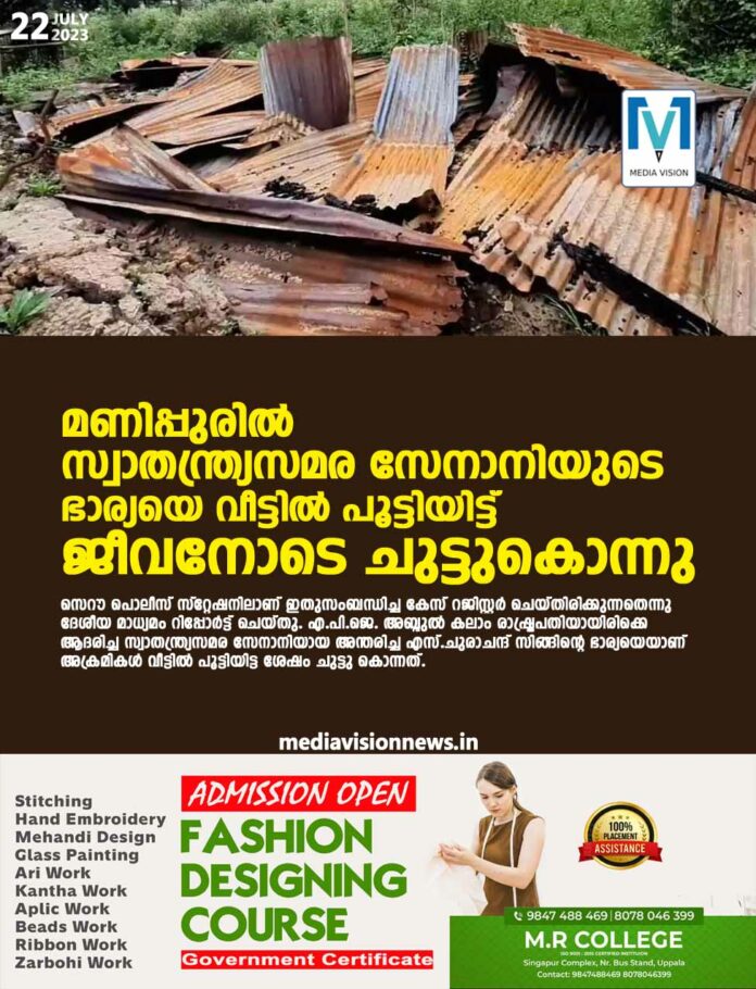 എ.പി.ജെ. അബ്ദുല് കലാം രാഷ്ട്രപതിയായിരിക്കെ ആദരിച്ച സ്വാതന്ത്ര്യസമര സേനാനിയായ അന്തരിച്ച എസ്.ചുരാചന്ദ് സിങ്ങിന്റെ ഭാര്യയെയാണ് അക്രമികള് വീട്ടില് പൂട്ടിയിട്ട ശേഷം ചുട്ടു കൊന്നത്. എണ്പതുകാരിയായ ഇബേതോംബി വീടിനുള്ളില് ഇരിക്കുമ്പോള് അക്രമികള് വീടു പുറത്തുനിന്ന് പൂട്ടിയ ശേഷം തീയിടുകയായിരുന്നു. ഓടിപ്പോയ കുടുംബാംഗങ്ങള് തിരിച്ച് എത്തുമ്പോഴേക്കും വീട് പൂര്ണമായി കത്തിനശിച്ചിരുന്നുവെന്ന് ഇബേതോംബിയുടെ കൊച്ചുമകന് പ്രേംകാന്ത പറഞ്ഞു. മുത്തശിയെ രക്ഷിക്കാന് ശ്രമിച്ച തനിക്കു നേരെ അക്രമികള് വെടിവച്ചുവെന്നും തലനാരിഴയ്ക്കാണു രക്ഷപ്പെട്ടതെന്നും പ്രേംകാന്ത പറഞ്ഞു. ഓടി രക്ഷപ്പെട്ടോളൂ, പിന്നീട് എന്നെ രക്ഷിക്കാന് തിരിച്ചുവരണമെന്ന് മുത്തശി ഉറക്കെ വിളിച്ചു പറഞ്ഞു. അതായിരുന്നു അവരുടെ അവസാന വാക്കുകള്. തിരിച്ചെത്തിയപ്പോള് മുത്തശിയുടെ തലയോട്ടിയും കുറച്ച് അസ്ഥികളും മാത്രമാണ് അവശേഷിച്ചത്. വീടിന്റെ അവശിഷ്ടങ്ങള്ക്കിടയില്നിന്ന് മുത്തശ്ശന് എ.പി.ജെ. അബ്ദുല് കലാമിനൊപ്പം നില്ക്കുന്ന ചിത്രം നശിക്കാതെ ലഭിച്ചുവെന്നും പ്രേംകാന്ത പറഞ്ഞു.