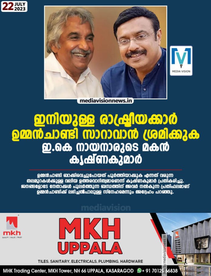 ഉമ്മന്ചാണ്ടി ബാക്കിവെച്ചുപോയത് പൂര്ത്തിയാക്കുക എന്നത് വരുന്ന തലമുറകള്ക്കുള്ള വലിയ ഉത്തരവാദിത്വമാണെന്ന് കൃഷ്ണകുമാര് പ്രതികരിച്ചു. ജനങ്ങളോടേ നേതാക്കള് പുലര്ത്തുന്ന ബന്ധത്തിന് അവര് നല്കുന്ന പ്രതിഫലമാണ് ഉമ്മന്ചാണ്ടിക്ക് ലഭിച്ചത്പോലുള്ള സ്നേഹമെന്നും അദ്ദേഹം പറഞ്ഞു.