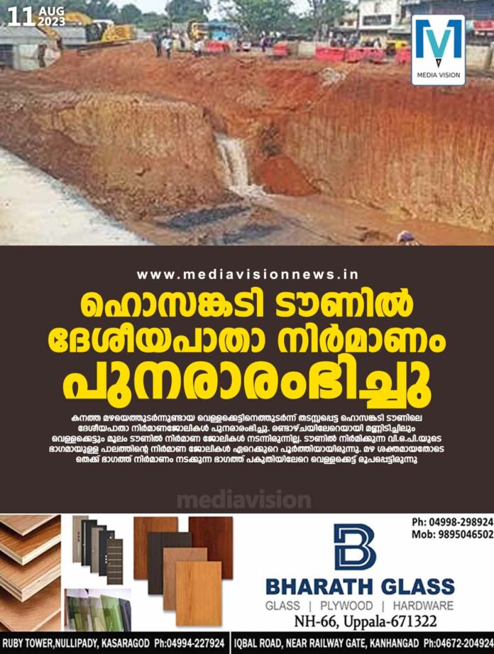 മഞ്ചേശ്വരം: കനത്ത മഴയെത്തുടർന്നുണ്ടായ വെള്ളക്കെട്ടിനെത്തുടർന്ന് തടസ്സപ്പെട്ട ഹൊസങ്കടി ടൗണിലെ ദേശീയപാതാ നിർമാണജോലികൾ പുനരാരംഭിച്ചു. രണ്ടാഴ്ചയിലേറെയായി മണ്ണിടിച്ചിലും വെള്ളക്കെട്ടും മൂലം ടൗണിൽ നിർമാണ ജോലികൾ നടന്നിരുന്നില്ല. ടൗണിൽ നിർമിക്കുന്ന വി.ഒ.പി.യുടെ ഭാഗമായുള്ള പാലത്തിന്റെ നിർമാണ ജോലികൾ ഏറെക്കുറെ പൂർത്തിയായിരുന്നു. മഴ ശക്തമായതോടെ തെക്ക് ഭാഗത്ത് നിർമാണം നടക്കുന്ന ഭാഗത്ത് പകുതിയിലേറെ വെള്ളക്കെട്ട് രൂപപ്പെട്ടിരുന്നു.
