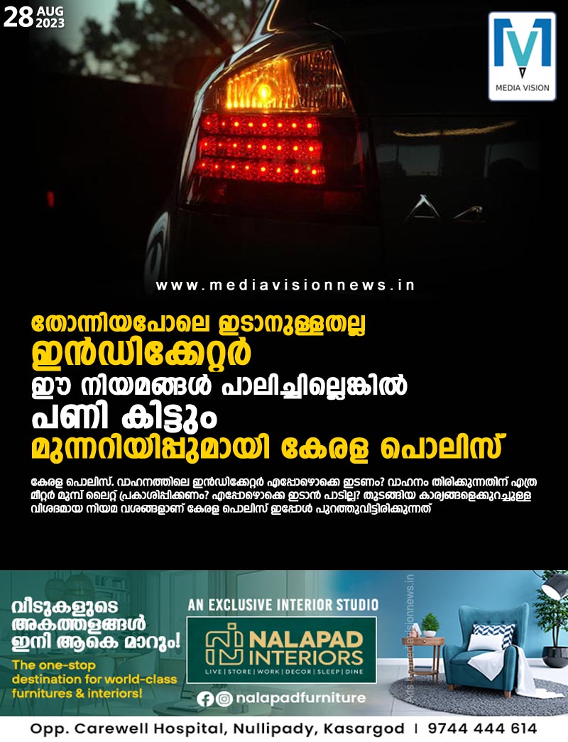 ഇടം വലം നോക്കാതെ ഇന്ഡിക്കേറ്ററിട്ട് റോഡില് സര്ക്കസുകാണിച്ച് അപകടങ്ങള് വരുത്തിവെക്കുന്ന ഡ്രൈവര്മാരുള്ള നാടാണ് നമ്മുടേത്. തോന്നിയപോലെ ഇടാനുള്ള സാധനമല്ല ഇന്ഡിക്കേറ്റര്. സിഗ്നല് നിയമങ്ങളെ കുറിച്ചുള്ള അജ്ഞതയാണ് പലരെയും അപകടങ്ങളില് കൊണ്ട് ചാടിക്കുന്നത്. ഇപ്പോഴിതാ ഇന്ഡിക്കേറ്റര് നിയമങ്ങളെക്കുറിച്ച് മുന്നറിയിപ്പുമായി രംഗത്തെത്തിയിരിക്കുകയാണ് കേരള പൊലിസ്. വാഹനത്തിലെ ഇന്ഡിക്കേറ്റര് എപ്പോഴൊക്കെ ഇടണം? വാഹനം തിരിക്കുന്നതിന് എത്ര മീറ്റര് മുമ്പ് ലൈറ്റ് പ്രകാശിപ്പിക്കണം? എപ്പോഴൊക്കെ ഇടാന് പാടില്ല? തുടങ്ങിയ കാര്യങ്ങളെക്കുറച്ചുള്ള വിശദമായ നിയമ വശങ്ങളാണ് കേരള പൊലിസ് ഇപ്പോള് പുറത്തുവിട്ടിരിക്കുന്നത്. ഫെയ്സ്ബുക്ക് പേജിലാണ് ഇന്ഡിക്കേറ്റര് നിയമങ്ങളെക്കുറിച്ചുള്ള വിശദാംശങ്ങള് പൊലിസ് പങ്കുവെച്ചത്.