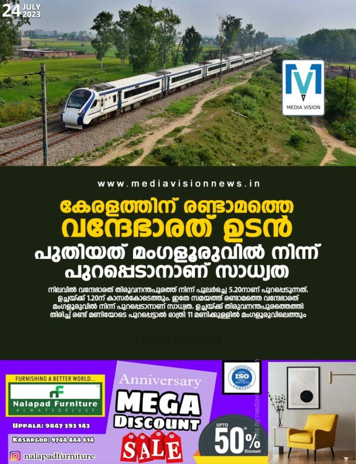 സംസ്ഥാനത്തേക്കുള്ള രണ്ടാമത്തെ വന്ദേഭാരത് ട്രെയിൻ ഉടൻ ഉണ്ടാകുമെന്ന് സൂചന. ഇതിന് മുന്നോടിയായി ലോക്കോ പൈലറ്റുമാർ ഉൾപ്പെടെയുള്ളവർക്ക് ചെന്നൈയിൽ പരിശീലനം തുടങ്ങി. മംഗളൂരുവിൽ പിറ്റ്ലൈനും സജ്ജമാക്കി. തിരുവനന്തപുരം – മംഗളൂരു റൂട്ടിലുള്ള ചില ട്രെയിനുകളുടെ സമയം മാറ്റിയതും ഇതിെൻറ ഭാഗമായാണ് കണക്കാക്കുന്നത്.