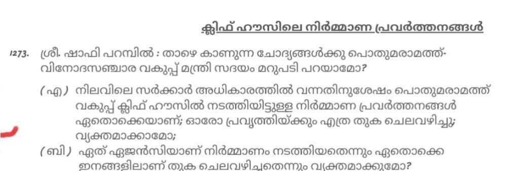 2016 നു ശേഷം മുഖ്യമന്ത്രിയുടെ ഔദ്യോഗിക വസതിയാ ക്‌ളിഫ് ഹൗസില്‍ നിര്‍മ്മാണ പ്രവര്‍ത്തനത്തിനായി എത്ര കോടി ചിലവാക്കിയെന്ന ഷാഫി പറമ്പില്‍ എം എല്‍ എയുടെ ചോദ്യത്തിനുള്ള മറുപടി പൊതുമരാമത്ത് വകുപ്പ് മന്ത്രി മുഹമ്മദ് റിയാസ് തടഞ്ഞുവച്ചുവെന്നാരോപണം. 2016 മുതല്‍ ഇതുവരെ ക്‌ളിഫ് ഹൗസില്‍ നടന്നത് 15 കോടിയുടെ നവീകരണ പ്രവര്‍ത്തനങ്ങളാണ് എന്നാണ് ടൂറിസം, പൊതുമരാമത്ത് വകുപ്പില്‍ നിന്ന് ലഭിക്കുന്ന വിവരം.