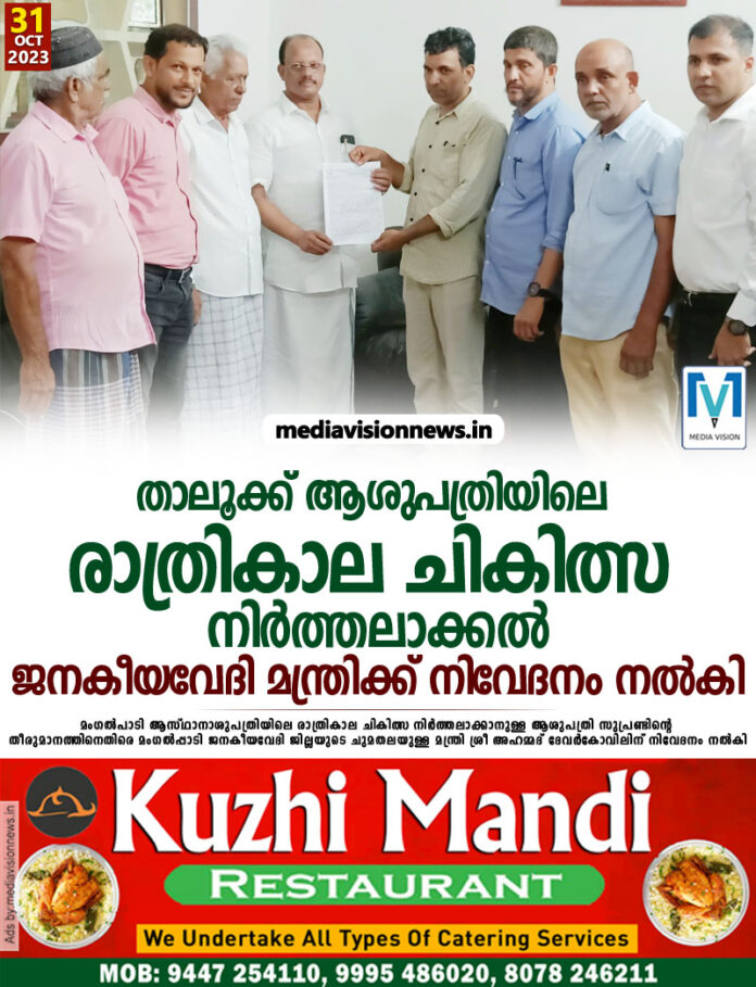 മഞ്ചേശ്വരം: മംഗൽപാടി ആസ്ഥാനാശുപത്രിയിലെ രാത്രികാല ചികിത്സ നിർത്തലാക്കാനുള്ള ആശുപത്രി സുപ്രണ്ടിന്റെ തീരുമാനത്തിനെതിരെ മംഗൽപ്പാടി ജനകീയവേദി ജില്ലയുടെ ചുമതലയുള്ള മന്ത്രി ശ്രീ അഹമ്മദ്‌ ദേവർകോവിലിന് നിവേദനം നൽകി.ജനകീയവേദി നേതാക്കളായ , സിദ്ദിഖ് കൈകമ്പ, അബു തമാം, മെഹമൂദ് കൈകമ്പ,അശാഫ്മൂസ,കെ എഫ് ഇക്ബാൽ എന്നിവരാണ് ഐ എൻ എൽ നേതാവ് ശ്രീ. ഫക്രുദ്ദിനൊപ്പംമന്ത്രിക്ക് നിവേദനം നൽകിയത്.