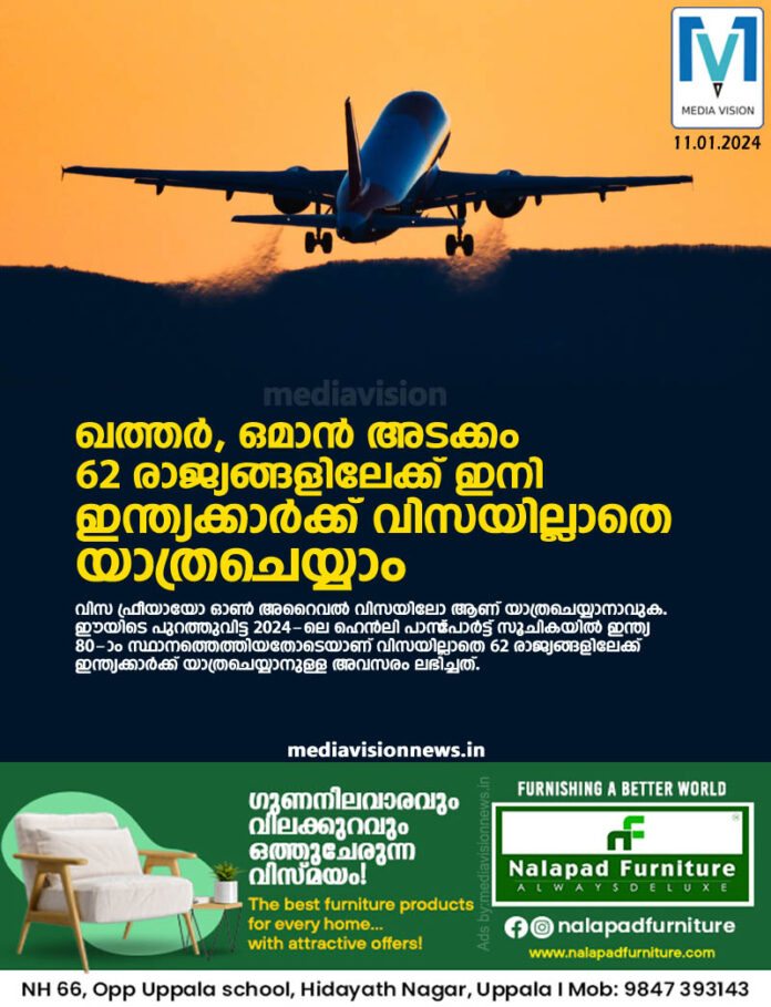 തായ്ലൻഡ്, മലേഷ്യ, ഖത്തര്, ശ്രീലങ്ക, ഇറാന്, ജോര്ദ്ദാന്, ഇന്ത്യോനേഷ്യ, മാലദ്വീപ്, മ്യാന്മാര്, നേപ്പാള്, ഒമാന്, ഭൂട്ടാന്, എത്യോപ്യ, കസാഖിസ്താന് തുടങ്ങി 62 രാജ്യങ്ങളിലേക്കാണ് വിസയില്ലാതെ ഇന്ത്യക്കാര്ക്ക് യാത്രചെയ്യാനാവുക.