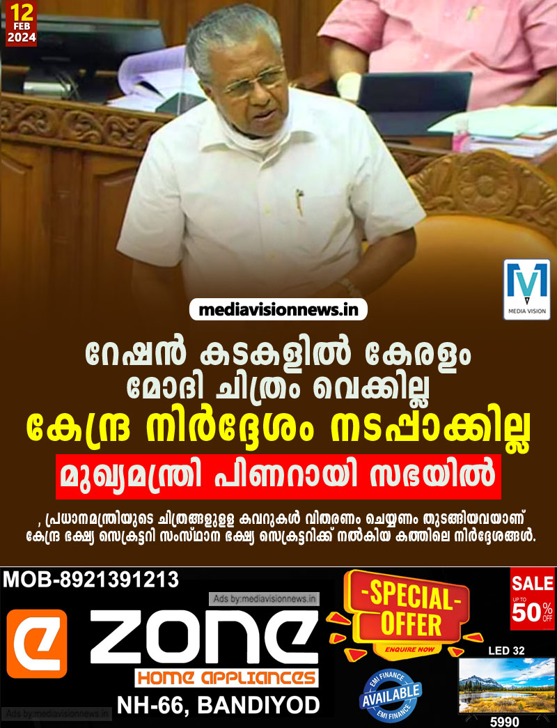 തിരുവനന്തപുരം : റേഷൻ കടകളിൽ മോദി ചിത്രം വെക്കണമെന്ന കേന്ദ്ര നിർദ്ദേശം നടപ്പിലാക്കില്ലെന്ന് മുഖ്യമന്ത്രി പിണറായി വിജയൻ നിയമസഭയിൽ. കേന്ദ്രം നിർദ്ദേശം ലഭിച്ചു. പ്രധാനമന്ത്രിയുടെ ചിത്രങ്ങൾ റേഷൻ ഷോപ്പുകളിൽ പ്രചരിപ്പിക്കുകയെന്നത് ഇതുവരെയില്ലാത്ത പ്രചരണ പരിപാടിയാണ്. കേരളം ഇത് നടപ്പാക്കില്ല. ഇക്കാര്യം കേന്ദ്രത്തെ അറിയിക്കും. വിഷയത്തിൽ തെരഞ്ഞെടുപ്പ് കമ്മീഷനെ സമീപിക്കുമെന്നും മുഖ്യമന്ത്രി വ്യക്തമാക്കി.