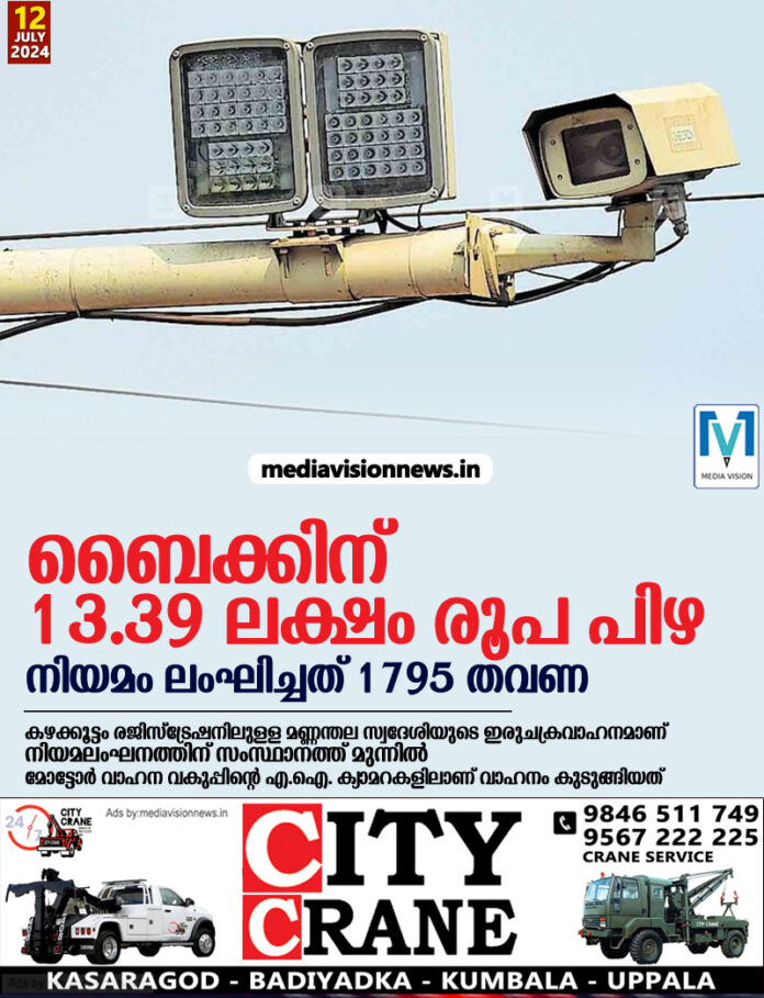 ബൈക്കിന് പിഴ 13.39 ലക്ഷം. ഒന്നും രണ്ടുമല്ല 1795 തവണ നിയമം ലംഘിച്ച കഴക്കൂട്ടം രജിസ്ട്രേഷനിലുള്ള മണ്ണന്തല സ്വദേശിയുടെ ഇരുചക്രവാഹനമാണ് നിയമലംഘനത്തിന് സംസ്ഥാനത്ത് മുന്നില്‍. മോട്ടോര്‍ വാഹന വകുപ്പിന്റെ എ.ഐ. ക്യാമറകളിലാണ് വാഹനം കുടുങ്ങിയത്.